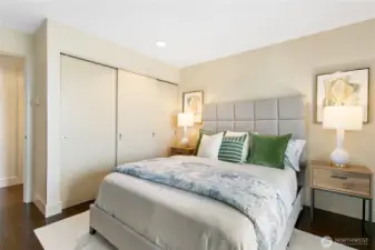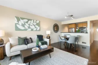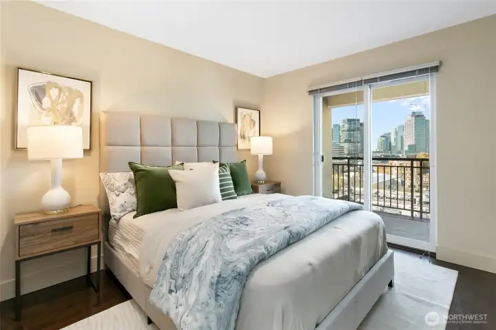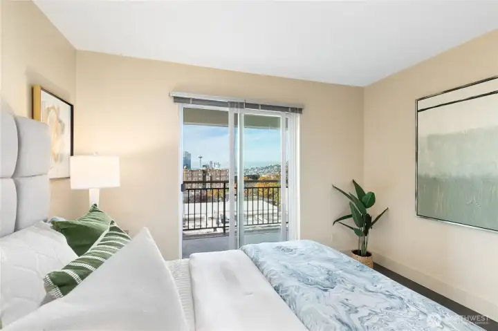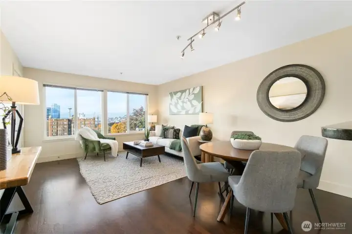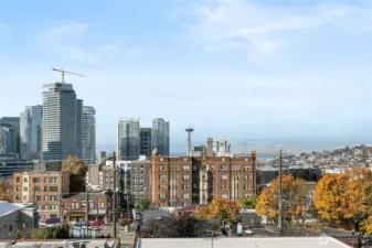 Perched on Capitol Hill's sunny west slope, this west-facing home showcases sweeping views of Puget Sound, downtown Seattle, the Space Needle, and the Olympic Mountains. Inside, enjoy rich hardwood floors, slab granite counters with undermount sink, stainless steel appliances, and abundant storage. The bathroom offers porcelain tile flooring and a freestanding vanity with stone top. The open, light-filled layout extends to a spacious deck accessible from both the living room and bedroom-perfect for entertaining or unwinding with a sunset view. Secure building with dedicated parking, close to shops, dining, and transit. A true must-see!