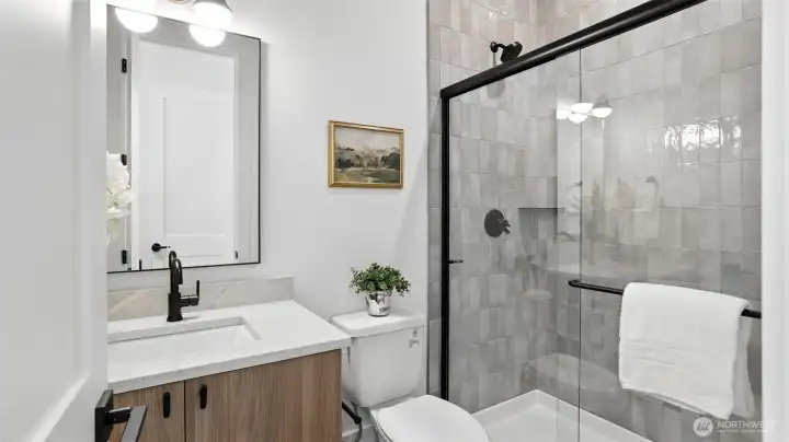 Welcome to The Sinclair - an exquisite new home by American Classic Homes, renowned across the Eastside for architectural excellence, now available in Lower Kennydale - Elegant and light-filled, this home showcases peekaboo views of Lk WA w/10' main-floor ceilings & an open design centered on a chef's kitchen and great room. A large island, walk-in pantry & Thermador appliances highlight the kitchen, while a main-floor guest suite & private den offer flexibility for work/multigenerational living. Enjoy entertaining on the covered back yard patio. Upstairs, retreat to a luxe primary suite w/ 2 walk-in closets and a spa-style bath. Complete with A/C, sprinklers, and a large garage, this home perfectly balances elegance and everyday comfort.