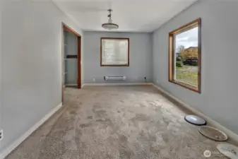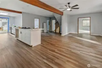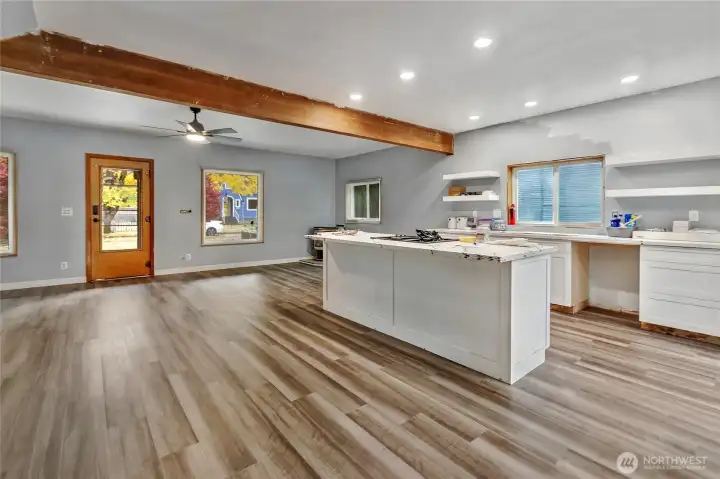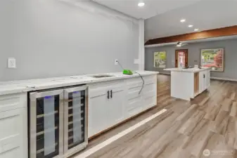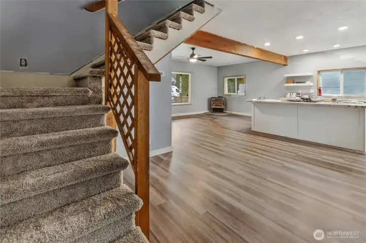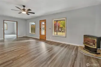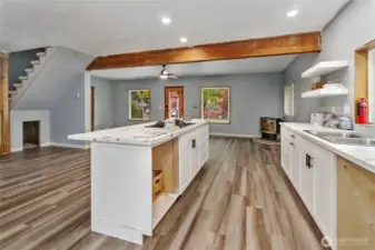 This charming Valley Home is almost finished! New flooring throughout, gorgeous quartz kitchen counters, new cabinets, wine fridge, open concept floorplan with free-standing gas fireplace. All appliances stay. Corner lot with detached 2-car garage and outbuilding. Covered deck plus patio area. After closing, Buyer will need to install bathroom vanities and sinks, hot water tank, and interior trim in a few areas. Washer/Dryer, dishwasher, stove-top and Oven in garage stay with home, as well as gas hot water tank.