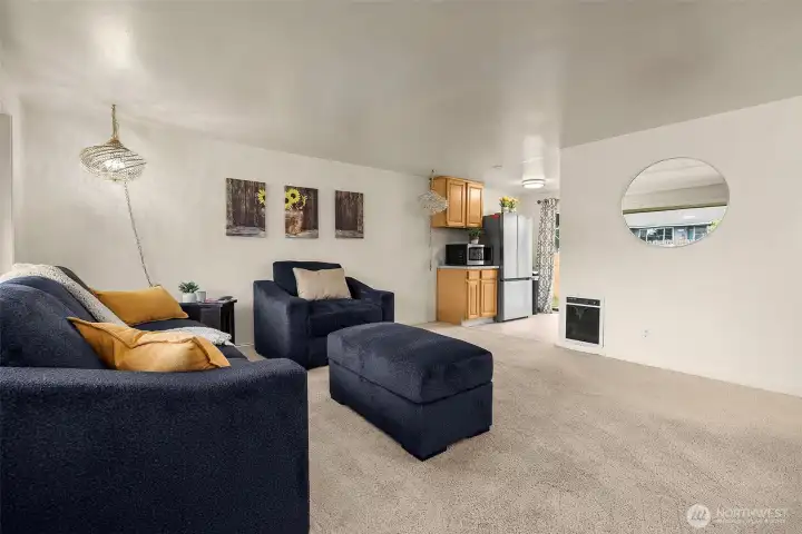 Charming rambler with zero access stairs in front or rear of the home offering easy, single-level living. This 2 bed, 1.75 bath home features a large living room with picture window overlooks the peaceful front yard. The kitchen has new countertops, single basin sink, new refrigerator in a fresh layout and opens to a covered patio—perfect for grilling, pets, or entertaining. The primary bedroom includes a walk-in closet, 3/4 bath and even backyard access. The guest bath features a jetted walk-in tub for added comfort and accessibility. Utility room has washer and dryer plus extra storage. Also, this home has a fully fenced backyard, carport, driveway & off street parking and is all located near I-5, Paine Field, Boeing, schools, & shopping.