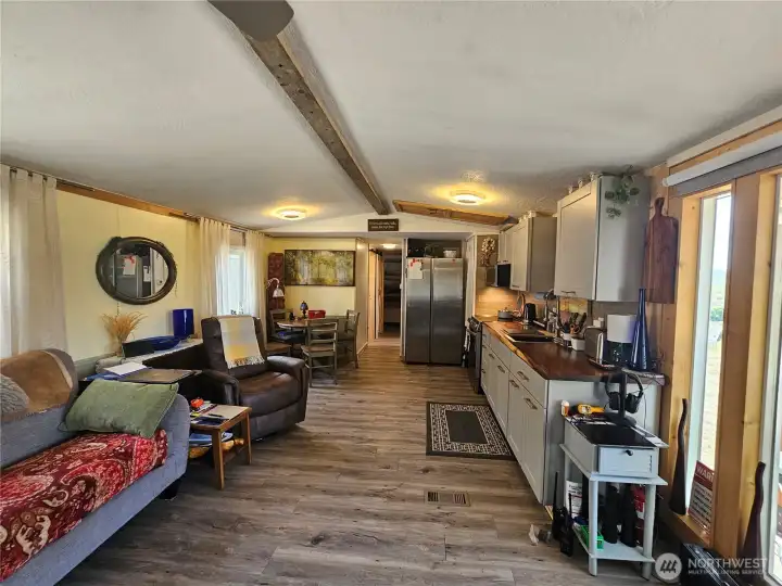 Affordable living on your own small acreage with a view of the Okanogan river and overlooking a panoramic view of the valley with incredible sunsets you can enjoy from your private patio/deck in the buff! Insulated hobby shed with propane heating plus a spacious storage shed to fit all of your toys! Professionally renovate with: new central heat/AC (2023); high quality vinyl plank flooring; new kitchen includes high end appliances; new higher pitch roof (2024); new bathroom with a soaker tub, high end vanity & all the fixtures; second bathroom renovated with a double walk-in shower; new paint & trim inside and out; water heater replaced (2022).