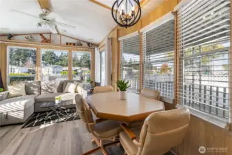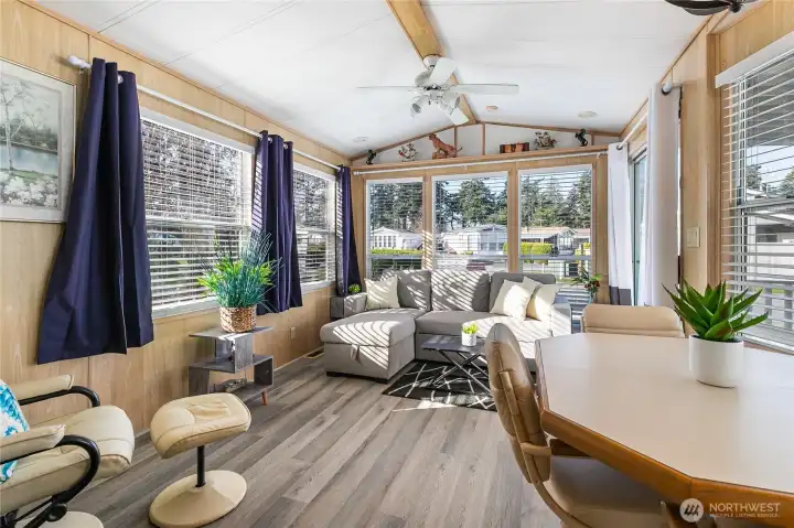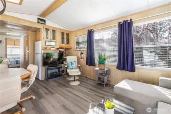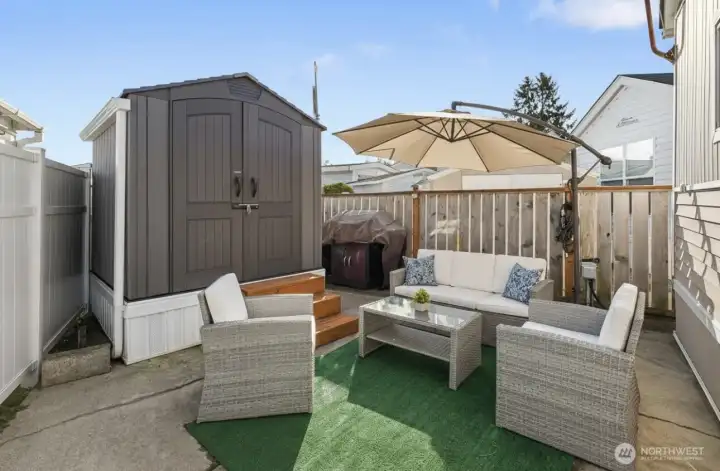Fall in love with this charming, fully furnished Park model. Light-filled and move-in ready, it features a cozy fireplace, new gray vinyl floors, and a fully equipped kitchen perfect for creating memories. Step outside to your private courtyard with grass, firepit, and serene concrete pad, ideal for relaxing evenings or gatherings with friends. With a new hot water tank, raised shed, and vinyl fencing, this gem is ready for you. Conveniently located near the park entrance and Bathhouse #1, it’s the perfect seasonal retreat!