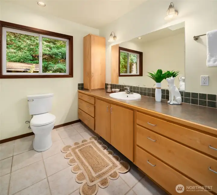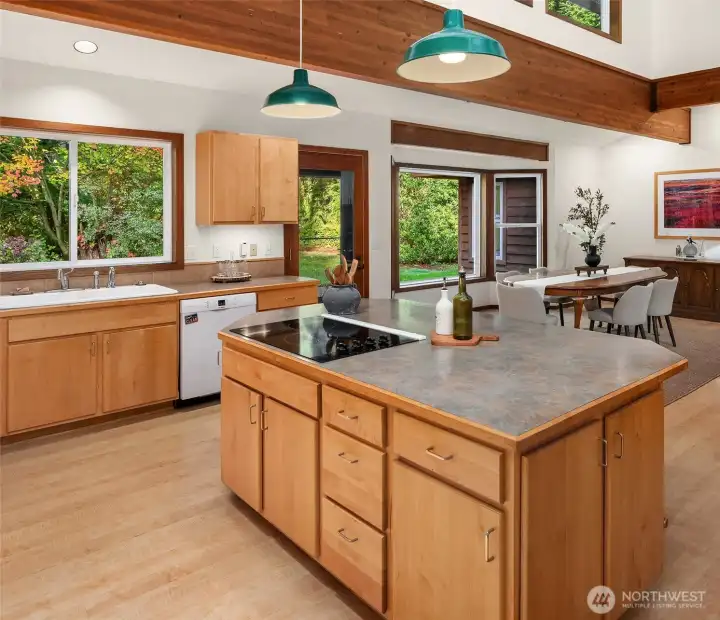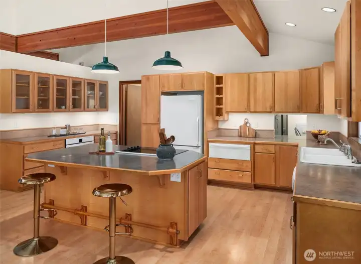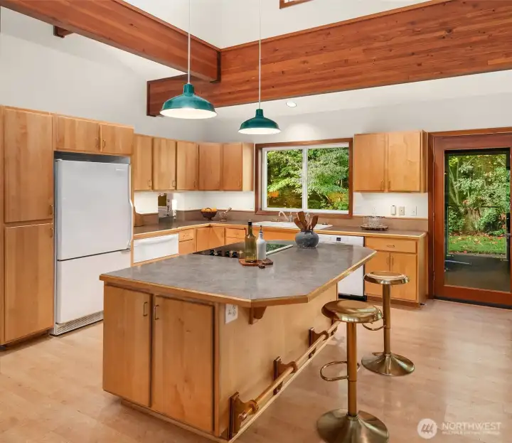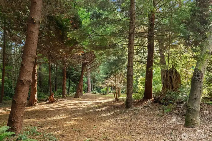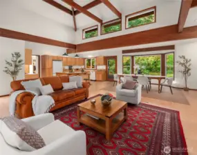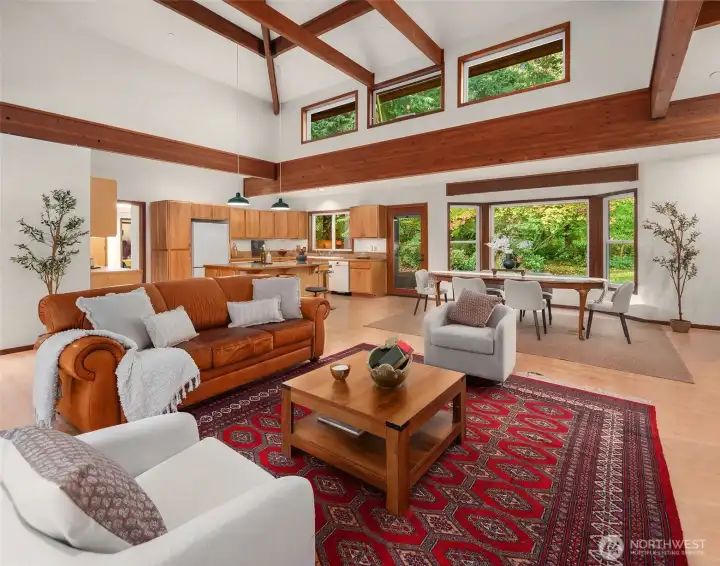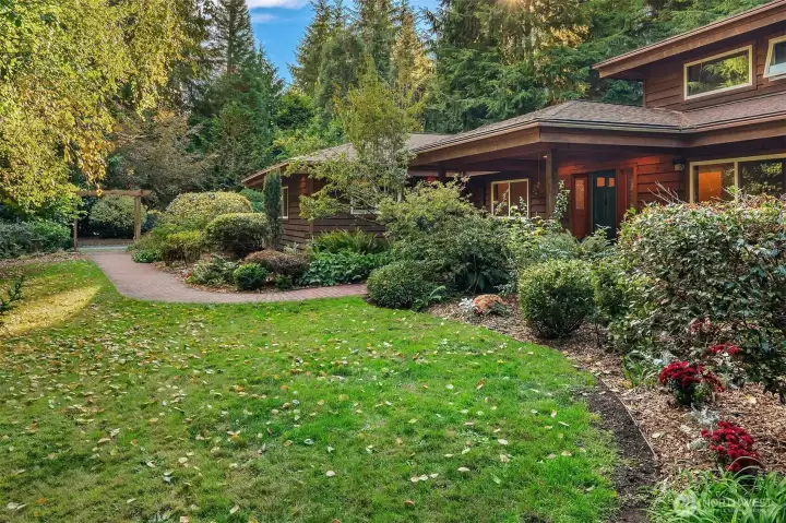 Retreat to this sanctuary settled in on nearly 3 acres of park-like gorgeous grounds. This light-filled, one level, solidly built Lindal Cedar Home sports soaring and beamed ceilings that crown an open Great Room and bedrooms. This meticulously cared-for home has many well planned accoutrements. Remote-controlled upper window ventilators make managing fresh air flow a breeze. 2 bedrooms, 3 baths, and a dedicated office/library, are warmed with radiant heat. Another additional room has separate entry. Handy are the utility sinks in the laundry/craft room as well as garage. A “doggie spa” shower area has radiant heat floors as well. 36” wide doorways for ease of maneuvering. Generator, garden shed and separate wood shed to boot!