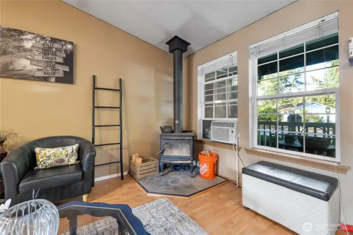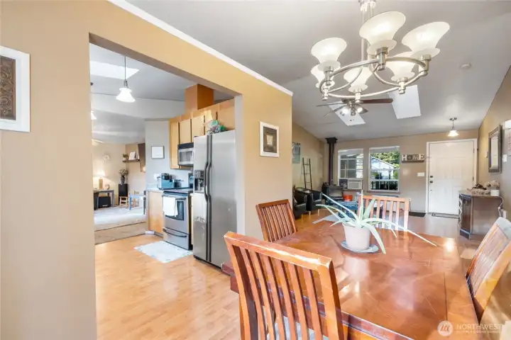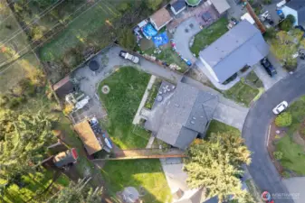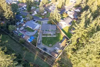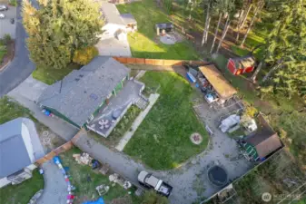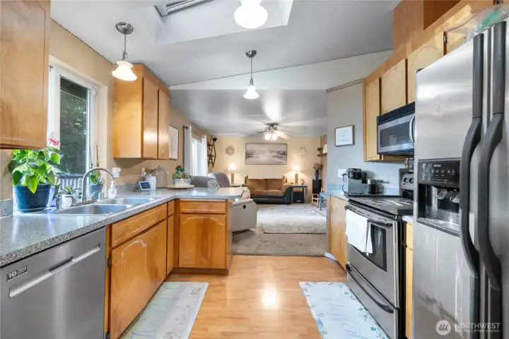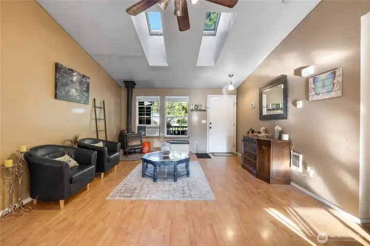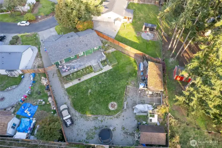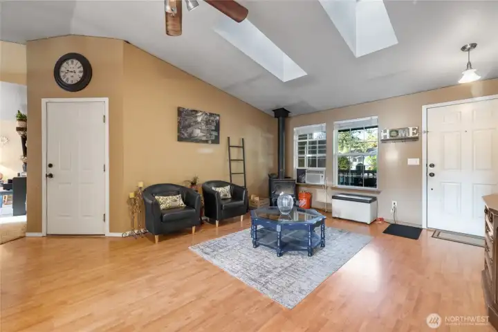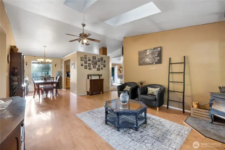 Charming one-story 3-bedroom, 2-bath home on a spacious 1/3-acre corner lot! Perfect for a starter or retirement home, this gem offers an open, light-filled layout with vaulted ceilings, skylights, and a cozy wood stove. The kitchen features stainless-steel appliances and a great flow for everyday living. The primary suite includes a walk-in closet and a private bath. Step outside to a massive private backyard oasis—fully fenced with a deck wired for a hot tub, fire pit, garden space, and RV/boat parking. A rare blend of comfort, privacy, and convenience—just minutes from JBLM, parks, and shopping!