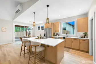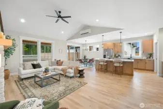 This stunning 4-bedroom, 1.75-bath home offers step-free access throughout, modern finishes, an open-concept layout, and a level spacious backyard. Enjoy vaulted ceilings and a cozy gas fireplace in the living room. The kitchen is both stylish and functional featuring quartz countertops, tiled backsplash, stainless steel appliances, a walk-in pantry and ample storage. The primary suite features a walk-in closet and a spa-inspired bathroom with a tiled shower and double vanity. Three additional bedrooms, a full bath, and a dedicated laundry room complete the interior. Step outside to a large, covered patio, perfect for relaxing or entertaining!