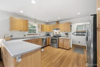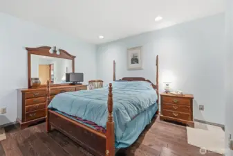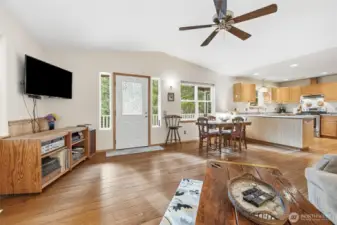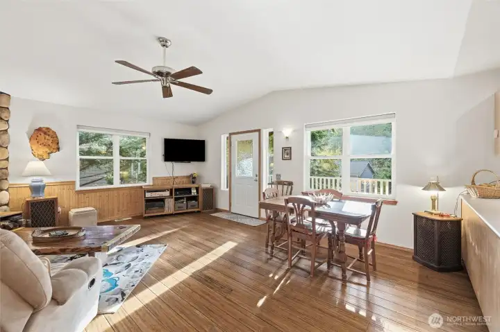 Well-kept 4-bed 2-bath Sudden Valley home with all rooms on one level. Open kitchen leads into spacious living room all with beautiful bamboo floors & flooded with natural light. With vaulted ceiling and stone hearth-fireplace it is cozy & welcoming. Generous sized covered deck off living room great for enjoying the natural setting amongst the trees. Primary bedroom with en-suite closet and private back deck. Additional 3 bedrooms perfect for space that can be used for bonus rooms, office etc. 2 car garage with built-ins for storage & work space. Low maintenance yard. All situated in a beautiful area with amenities including trails, pool, golf course, marina & more!