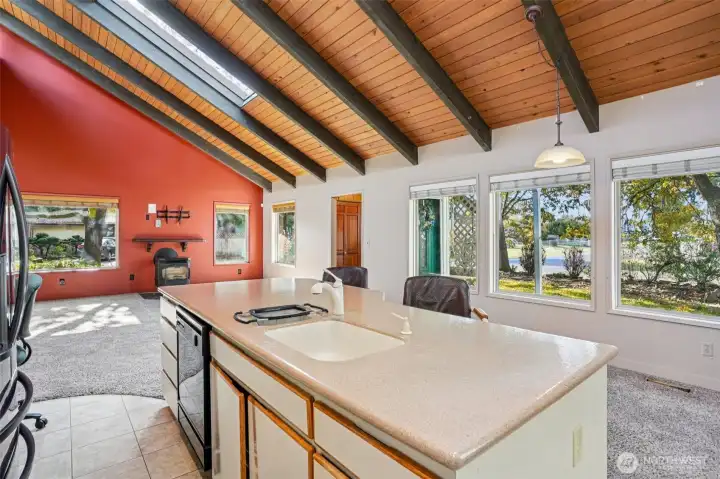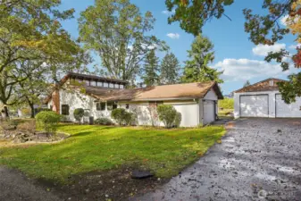 Fabulous Spacious Mid-Century Modern Open Concept Home! Custom Built emphasis on clean lines and user friendly spaces. Vaulted ceiling, skylights, built in vacuum system, fully equipped kitchen (all appliances and W/D stay) tons of cabinet space. Security System in place. Warmed by heat pump and pellet stove. Attached oversize garage, detached shop, storage shed, and garden beds on 15,000 sq. ft. corner lot! Private and Quiet! Move in ready for you and your possessions. Newer 50 year roof 2014. Close to JBLM, Schools, Universities,PLU, parks and shopping.Add your special touches and enjoy the coming Winter!