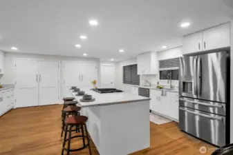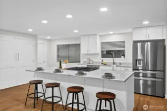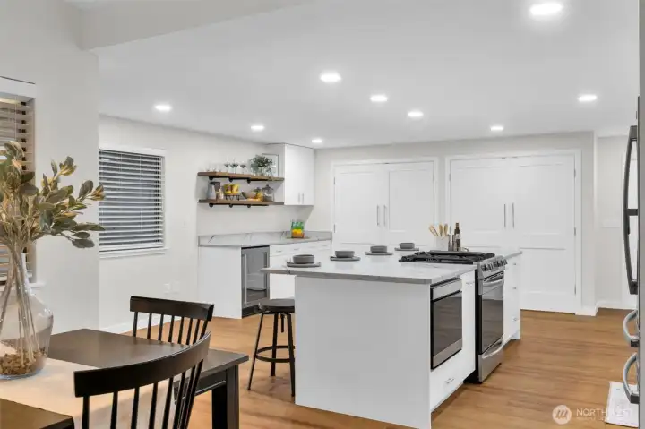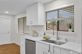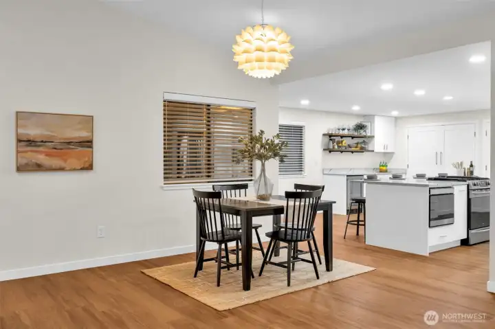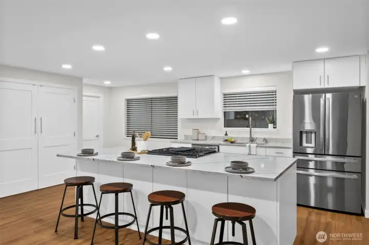 Fully remodeled Huntington Park Rambler! Great room style floor plan flowing over beautiful waterproof luxury vinyl flooring. The living area is fashioned around a beautiful gas fireplace. A large sliding glass door lets in tons of natural light and leads to a deck and back yard surrounded by trees. The brand-new kitchen has white cabinets, quartz countertops and a huge island with seating, plus a walk-in panty with tons of storage. There is room for a kitchen table next to a second sliding glass door that leads to a patio w/ dedicated gas line for a BBQ. The primary suite is large with a full wall of closet space. The primary bathroom has a large walk-in shower & double sinks. Second bedroom and full bath. 2 car garage with sink