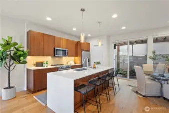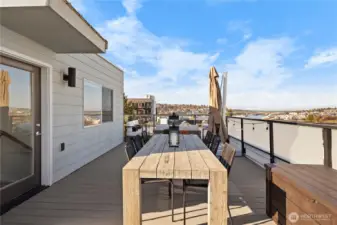 Sleek urban living meets stunning Seattle views in this Built Green 4-Star Eastlake townhouse by Murray Franklyn and Caron Architects. This corner unit offers a rare, expansive layout—open living, dining, and kitchen on the main level; two bedrooms and a bath on the second; and a private top-floor primary suite with a den ideal for work from home. The 500 square foot rooftop terrace showcases unobstructed views of Lake Union, the Space Needle, and the city skyline—perfect for fireworks and gatherings. With high walk and bike scores, and a reserved parking space, you’re steps from Eastlake’s best dining, bars, and shops. Turn-key, move-in ready, and built in 2017—your modern city sanctuary awaits.