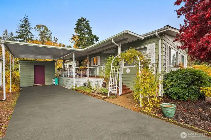 Welcome to your storybook retreat in The Pointe at Lockwood, a pet-friendly 55+ community b/w Bothell & Kenmore! For anyone living their best heritage-inspired life—this home wraps you in charm from the moment you walk in. This bright, remodeled Heirloom-style meets English-cottage gem blends vintage charm with modern comfort. Step inside to fresh walls, crown molding, updated flooring, remodeled baths, skylights & vinyl windows that fill each space with light. Enjoy a breakfast bar & built-in china cabinet for teatime. The covered deck opens to your private gardener’s haven on a peaceful greenbelt. Workshop with power, 2+ car carport, steps to clubhouse, mailboxes & McMenamin’s saltwater pool. If comfort calls to you, this home answers.