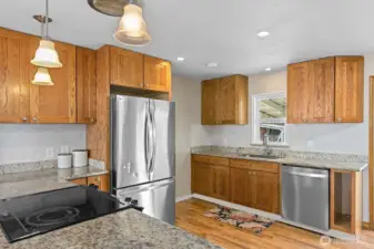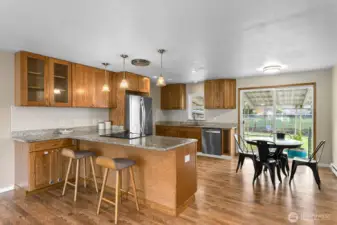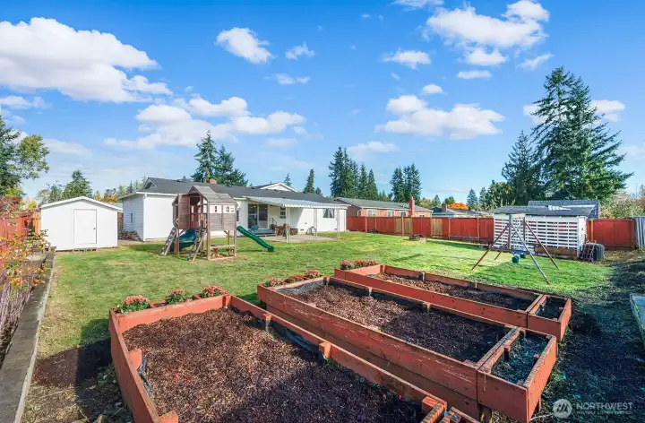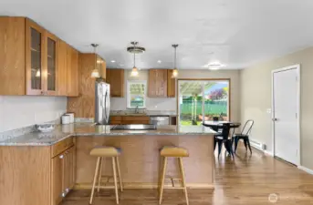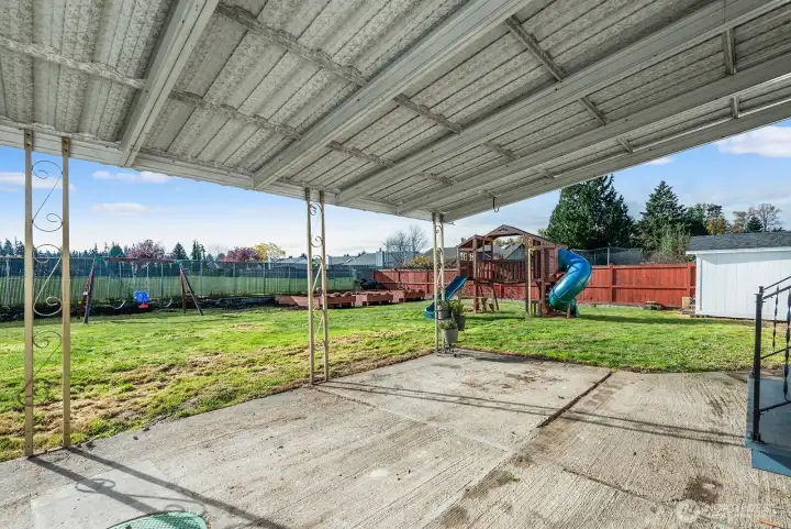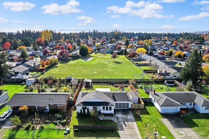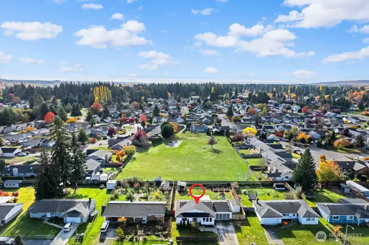 Nestled on a quiet, friendly street, this beautifully updated Marysville home sits on a large, level lot backing to a peaceful park. Endless outdoor possibilities- huge play area, garden space, extra storage & big covered patio perfect for entertaining year-round. Step inside: expansive great rm where the kitchen, dining & living areas flow seamlessly together—ideal for modern living & gatherings. Updated kitchen features granite countertops, soft-close drawers & plenty of workspace, opening to the bright dining area & living rm w/hardwood floors and cozy fireplace/woodstove. Double attached garage offers ample parking +room for a workbench/hobby area. Convenient to Amazon, parks, shopping, Tulalip, outlet mall & more. Welcome home!