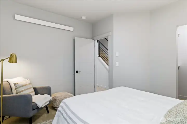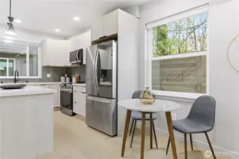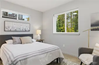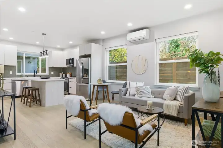 Luxury gated townhome community! 5 homes left! This home is set back in the community with the most private feel. Open concept main floor living boasts a stunning island kitchen w/ thoughtful half bath. Primary bed w/ beautiful bath & serene back deck. Two more spacious beds up & additional bath. Each home built green w/ high-end energy-efficient materials including metal roofing, cement siding, & ductless mini-split systems. Engineered hardwoods, ceramic tile, quartz counters, large picture windows, skylights, & designer hardware + fixtures throughout. Enjoy spacious closets & walk-in showers. BONUS washer/dryer + video doorbell included. Secure parking & fully fenced lot backs to 10k sq ft private wooded space. Low HOA dues!