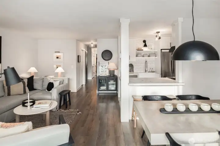 Exquisitely Renovated Upper Floor 2 Bd Condo in Kirkland, Salish Village. LVP flooring thru-out, inviting chef's kitchen w/new cabinetry, quartz countertops, farmhouse sink, tile backsplash, SS appliances & pantry. Open concept living & dining w/South facing deck! New doors, trim, ceiling refinished & interior paint. Updated bath w/marble floors, resurfaced shower/tub & vanity. New Shelving Systems in Primary + additl Bed/bonus room. Washer/Dryer in Unit. Amenities: EV Charger/Pool/hot tub/gym/party rm. 1 covered parking spot, lots of guest parking, no rental cap, strong HOA & investment potential! Lk Wa Schools! Min to The Village Shops at Totem Lake, Evergreen Hospital & Woodinville Wineries! Near 405/520, Microsoft, Amazon, Dntn Kirkland