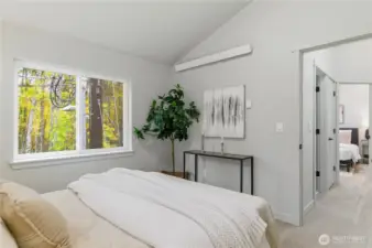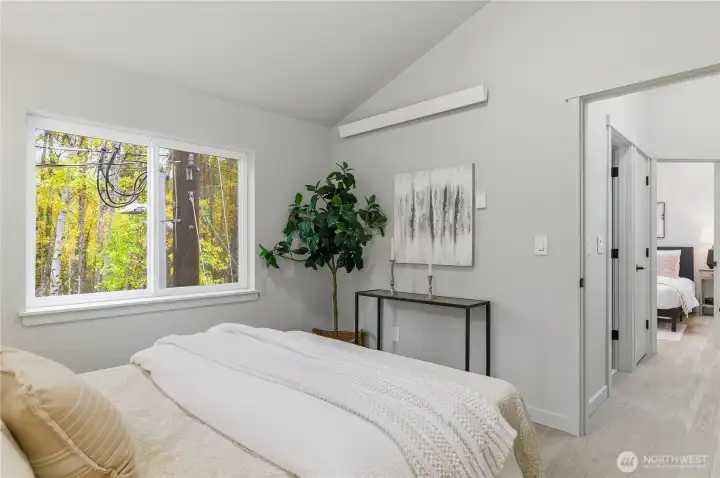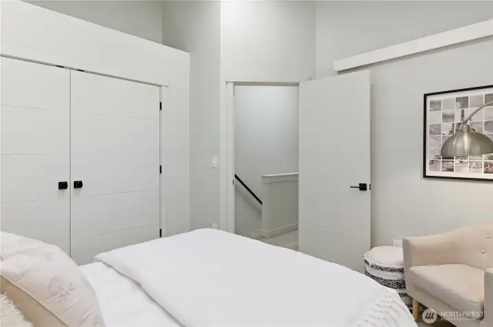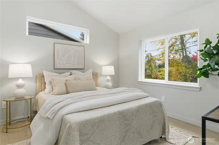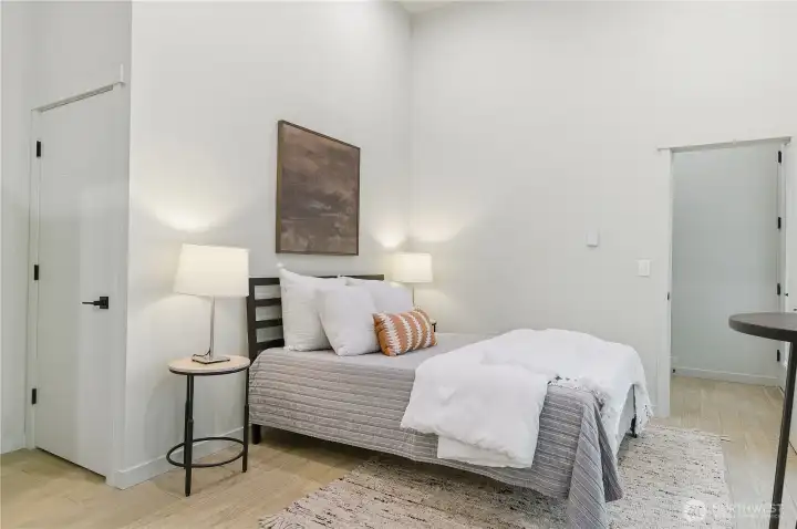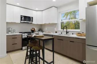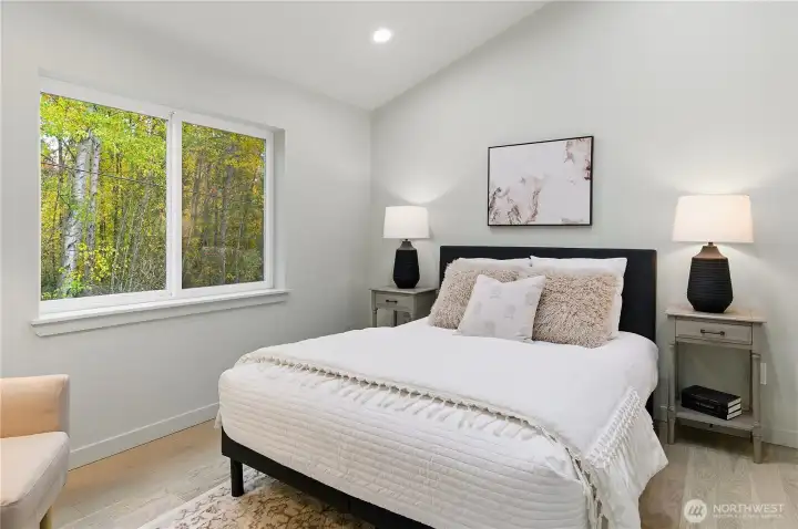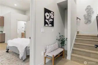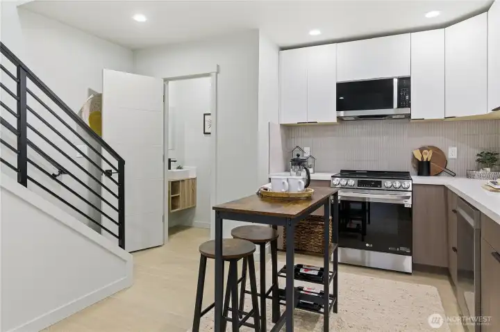 Luxury gated townhome community! 5 homes left! This home features a ground level ADU live/work space w/ open concept living + kitchen & bath. Upstairs you will find a well appointed kitchen that seamlessly flows to the living room w/ thoughtful half bath. Two more spacious beds up & additional bath. Each home built green w/ high-end energy-efficient materials including metal roofing, cement siding, & ductless mini-split systems. Engineered hardwoods, ceramic tile, quartz counters, large picture windows, skylights, & designer hardware + fixtures throughout. Enjoy spacious closets & walk-in showers. BONUS washer/dryer + video doorbell included. Secure covered parking & fully fenced lot backs to 10k sq ft private wooded space. Low HOA dues!
