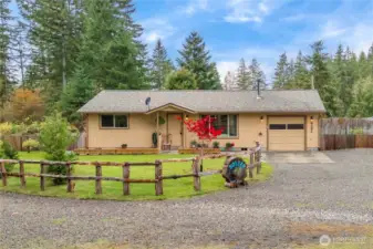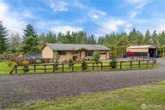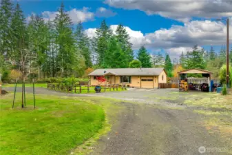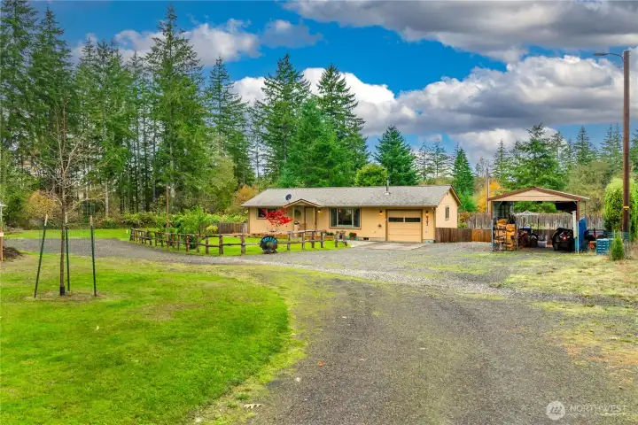 WELCOME HOME! You’ve found the rambler on acreage you’ve been dreaming of! This charming 2BD/1BA home features the open kitchen/dining/living combination perfect for everyday living with updated flooring, appliances, countertops and more. The garage would be great for hobbies or storage and the additional carport and shed allow for even more tinkering or toys. Step out onto the covered patio and enjoy the peaceful surroundings while exploring the sprawling lawns and nature. This property offers endless potential. Want to put in a large garden, space for animals or maybe even a camping area for guests, there are so many possibilities. This property offers room to live, play, and dream! Hurry you don't want to miss this gem!