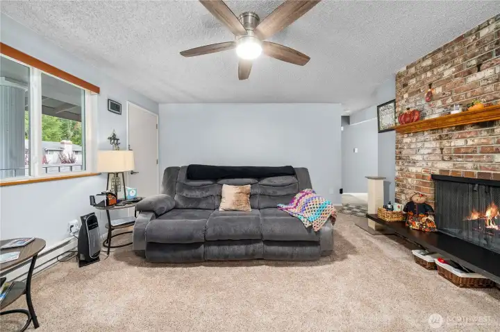 Discover this beautifully maintained top-floor condo, featuring 2 bedrooms and 1.5 baths, located within a secure gated community. Spanning 933 sq ft, this home boasts a cozy wood-burning fireplace, a private balcony accessible from the eat-in kitchen, and an additional front deck for outdoor enjoyment. The spacious primary bedroom offers a walk-in closet and an en-suite half bath for added convenience. In-unit laundry enhances practicality, while a covered assigned parking space simplifies daily living.Residents can take advantage of community amenities, including an outdoor pool, a walking path, proximity to Chambers Bay and less than a mile to Cirque Park. The community also has secured boat/RV storage and an assigned storage unit.