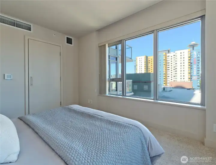Great opportunity to join the Insignia lifestyle. This wonderful 7th floor corner unit provides easy access to both towers, Indoor Pool, Fitness center, yoga and pilates studio, Theater room and BBQ Terrace with fireplace. The 41st floor Sky Lounge/Party room and rooftop decks have spectacular panoramic views. Interior of this unit is spacious and bright with with light and dark sandstone color wood finishes. Optimal open floorplan lives larger than sq footage. Both bedrooms have walk-in closets with California closets in primary bedroom. View of Space Needle from Primary . Brand new carpet in rooms and new paint throughout. Patio is fully enclosed and private. One EV parking space and Storage included.