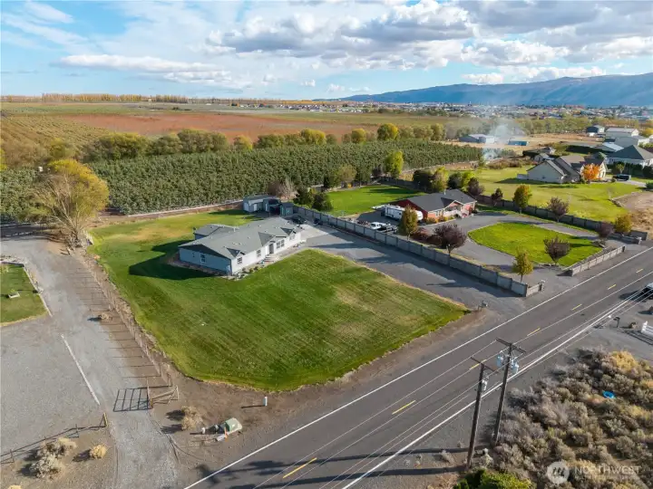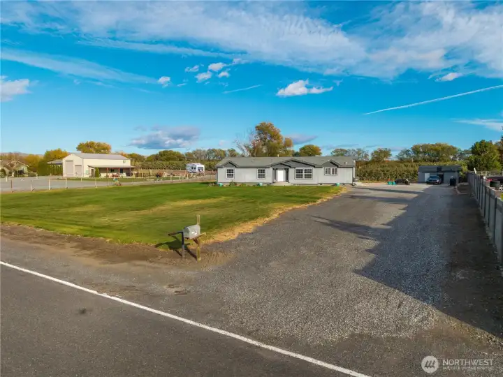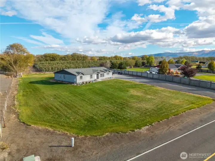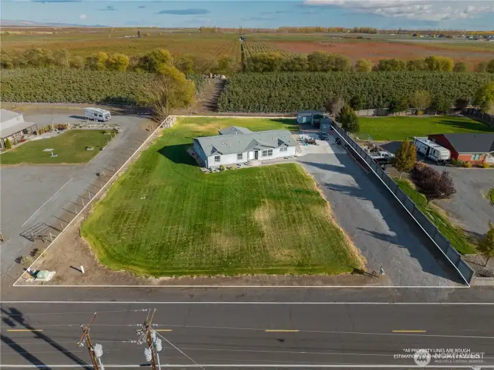 Expansive 4 bed, 2.5-bath home on 1 full acre with sweeping mountain, river, orchard/vineyard views & spectacular sunsets. Nearly 3,000 sq ft of living space features beautiful flooring throughout, vaulted ceilings, walk-in pantry with lighting, dining room, reverse osmosis water filtration, skylights, A/C, laundry/utility room with deep sink, plus an enormous bonus room. Stunning kitchen with large center island & designer appliances. Primary includes 5pc bath with soaking tub, dual vanity, & large walk-in closet. Outdoor amenities include sprinkler system, RV parking, and multiple sheds/outbuildings including a 12x24 garage door - ideal for equipment, storage or shop use. Quiet setting with little traffic & views in every direction!