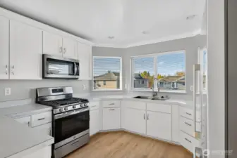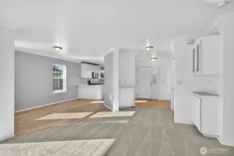 Welcome to this spacious 1,493 sq. ft. upper unit, open floor plan home. Lots of windows allowing bright light in. Newly remodeled kitchen with a pantry, new kitchen windows, new LVP flooring & a spacious dining area that connects the large living room with a corner gas fireplace to curl up to. New carpeting throughout. Covered balcony for all weather use. Primary bedroom has a walk-in closet and an ensuite bathroom with a jetted tub, separate shower & double vanity. Roomy second bedroom is located next to another full bathroom. Separate laundry room has ample space with new washer and dryer. More closet space in the hall & entry. Two dedicated parking spots out front with one covered. Close to all amenities!