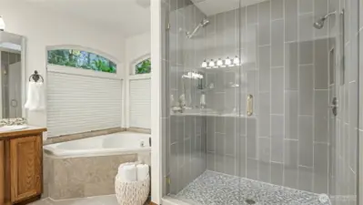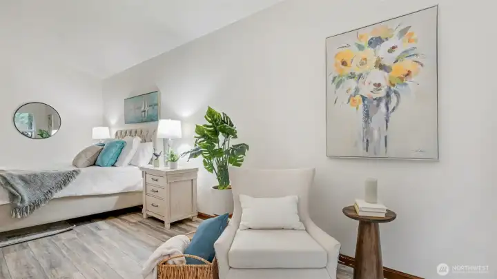 Majestic, gated woodland property with contemporary home on shy 5 acres. Unique floorplan has 4 bedrooms and 2.75 baths on the main level; bonus room w/exercise studio upstairs. Main level provides soaring vaulted ceilings, abundant windows, hardwood floor in main living spaces. Kitchen has ample cabinet & counter space, walk-in pantry, granite counters. Great room w/fireplace, ceiling-to-floor brick and stone work; Primary suite features dramatic 5-piece bath w/heated floor, dual sinks, soaking tub, 2-person shower, 2 walk-in closets, and a sitting area w/French doors to back deck. Home has additional full bath. The 4th bedroom and ¾ bath create a guest suite. Yard has built-in firepit, entertainment deck, gas piped for BBQ. 3-car garage.