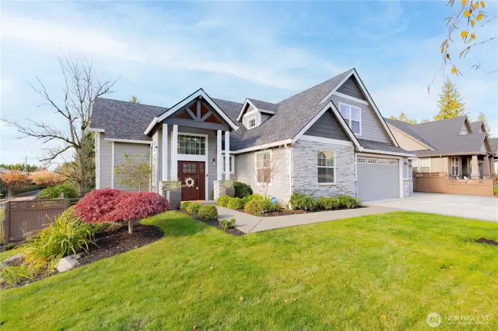 Stunning custom home with vaulted ceilings, south-facing windows, engineered hardwoods, and premium finishes throughout. Chef’s kitchen showcases a massive quartz island with prep sink, pot filler, and locally crafted cabinetry. Living room features a Montigo gas fireplace with Carrera tile surround, built-ins, and wired speakers. Luxurious primary suite includes a soaking tub and oversized tiled shower. Fully permitted ADU offers a private entrance, HVAC, kitchenette, bedroom, and bath. Outdoor living shines with a 28x14 covered TimberTech deck, fire pit, garden beds, and fenced yard. 1.5 miles to Legacy Salmon Creek Hospital & WSU Vancouver. Zoned for Skyview High’s elite STEM Magnet program.