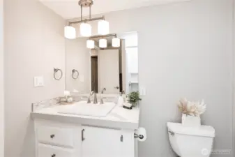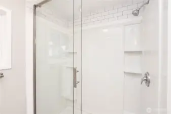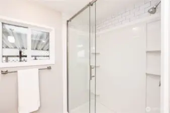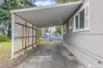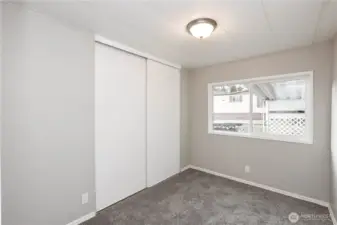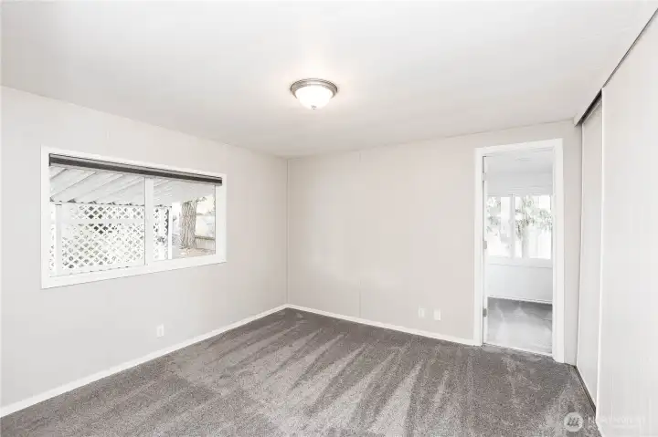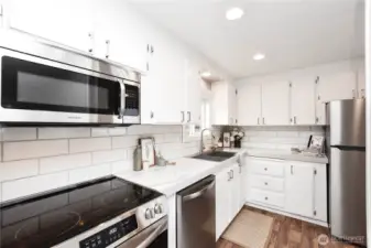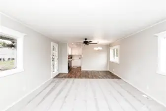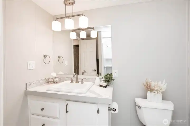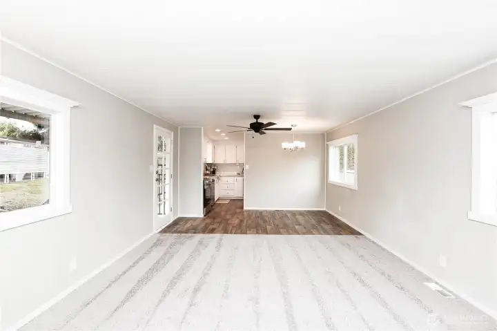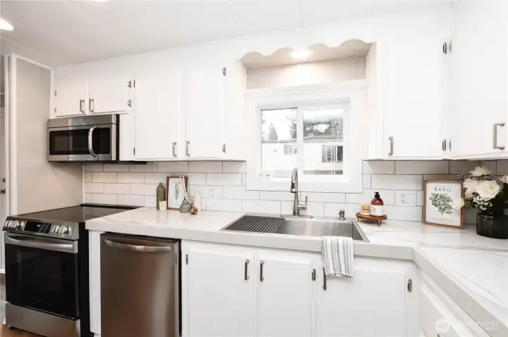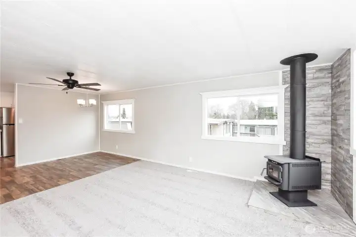 Beautifully updated and move-in ready in 55+ & Older Park! This spacious home welcomes you with an open floor plan featuring a cozy wood-burning stove and abundant natural light. The bright kitchen boasts beautiful shaker cabinetry, tile countertops, stainless steel appliances, and a large farmhouse-style sink. Enjoy two generous bedrooms plus a flexible den/office space at the rear of the home. The stylish bathroom offers a walk-in shower with glass door and subway tile, modern vanity, and updated flooring. Washer & dryer included. New carpet in living room + bedroom. Conveniently located near shopping and amenities—this one is a must see!