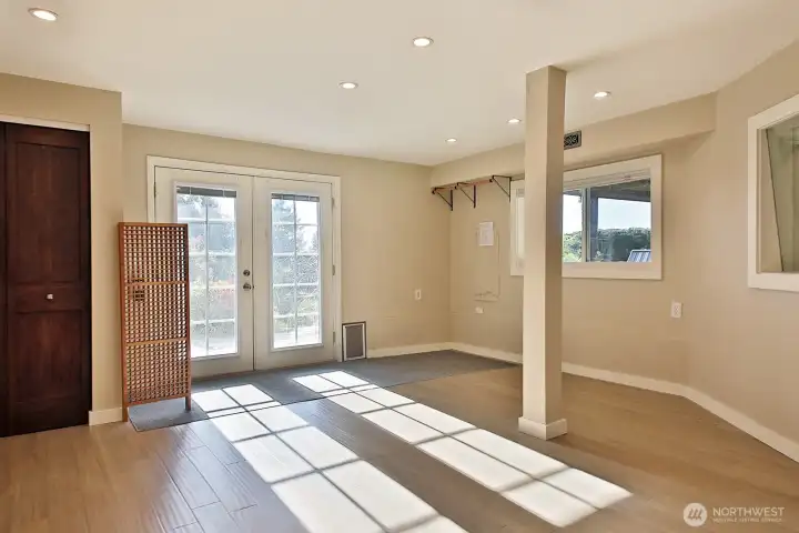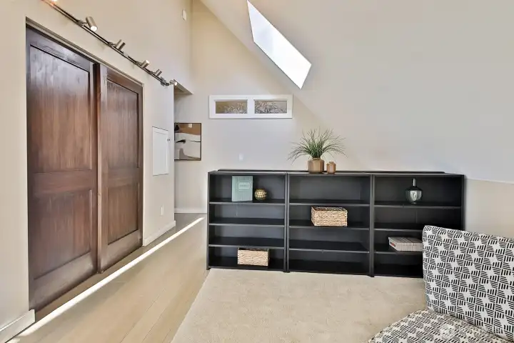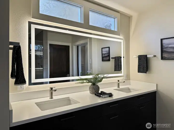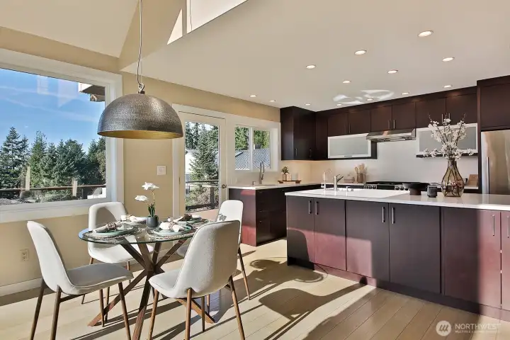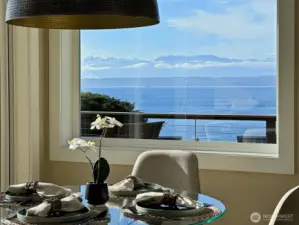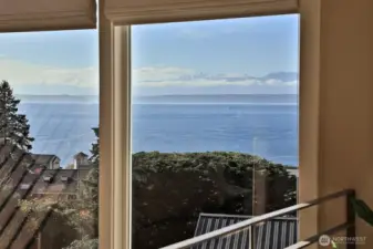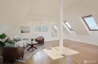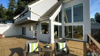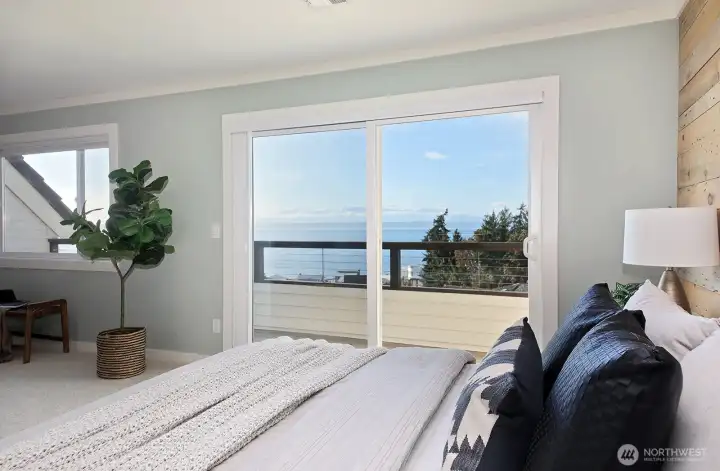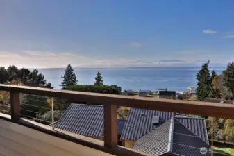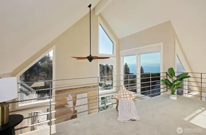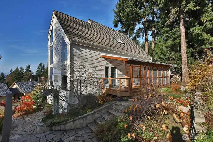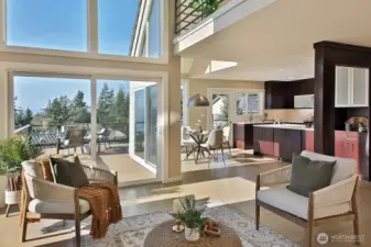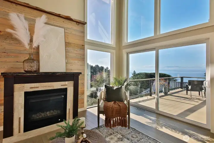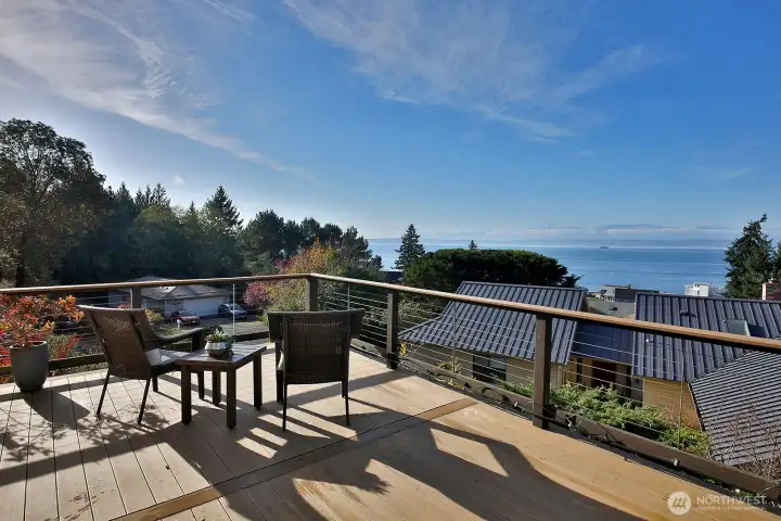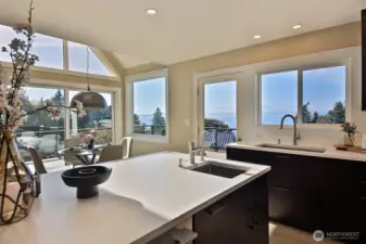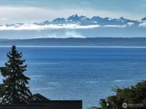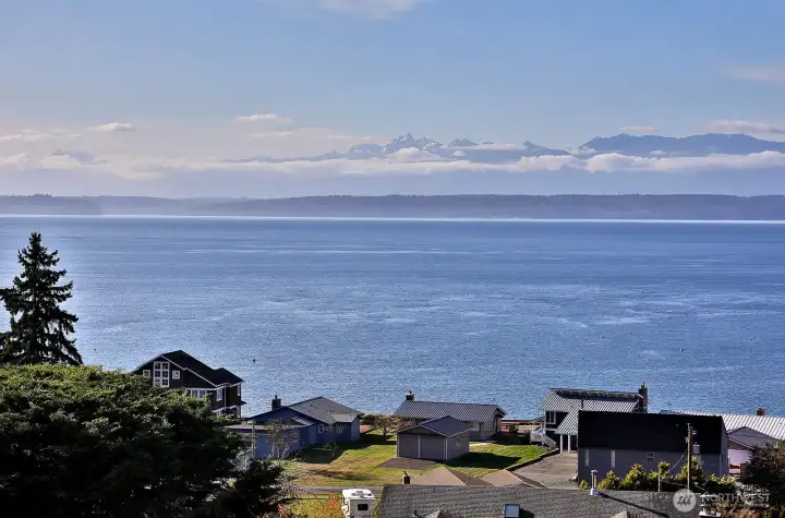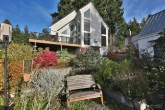 Soaring ceilings and a wall of windows provide westside views of Mutiny Bay, shipping lanes and Olympic mountains from every level of this contemporary home. High-end kitchen remodel and updated bathrooms make this home move in ready. Primary bedroom suite on main level with additional bedroom suite on upper level with view balcony. Studio area above garage with full bath is flexible to meet your needs. Mature English cottage garden is fully fenced and provides year-round interest with fruit trees and flowers galore. Major systems have been updated or replaced for your peace of mind. Nearby Robinson Beach Park on Mutiny Bay provides access to one of Whidbey's finest sugar sand beaches.