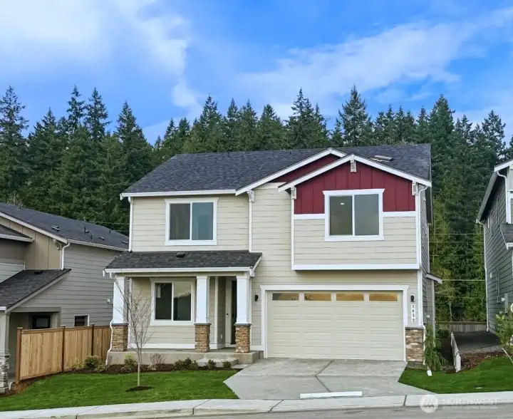 This new construction Bennett plan at Liberty Bay Vista is Move-In Ready, featuring nearly 2400 sq ft, 4 bedrooms, 3 baths, and a 2-car garage. The main level offers 9' ceilings & a convenient main-floor bedroom & bath w/tiled walk-in shower, ideal for guests or multi-generational living. The light & bright great room is anchored by a cozy gas fireplace & opens to the gourmet chef’s island kitchen that includes 42" soft-close white solid-wood cabinetry, quartz countertops, tile backsplash, under-cabinet lighting, a gas cooktop & hood, built-in wall oven & microwave & walk-in pantry. Enjoy summer sunsets + peek-a-boo views from the welcoming front porch & upstairs front windows. The front & backyards are flat & fully landscaped w/a patio & rear fence. Upstairs, the owner’s suite impresses with wide windows, a walk-in closet, and 5-piece en-suite bath featuring raised-height dual undermount sink quartz topped vanity, a soaking tub & separate walk-in shower surrounded w/tile & heavy frameless glass. The expansive loft splits the primary from 2 oversized bedrooms that share a full hall bath w/a raised-height dual undermount sink quartz topped vanity & a tub/shower w/tile surround. The Laundry room includes a sink & cabinetry. A/C, 8' garage & 8' front door. Only Minutes to Bainbridge & Kingston ferries. All 3 North Kitsap schools & downtown Poulsbo waterfront shopping/dining are just steps away! Buyer’s Broker must accompany and/or register Buyer at or before first visit.