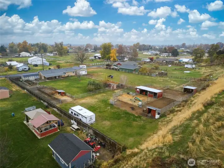 Hobby farm opportunity! Located in a peaceful country setting, this newer manufactured home offers 3 bedrooms, 2 bathrooms on 1.55 acres. Home boasts vaulted ceilings, an inviting open layout, and a well-designed split floor plan that provides privacy for all. The spacious primary suite features a large bathroom & walk in closet, while two additional bedrooms & a full bath are located on the opposite end of the home. The kitchen is equipped with an island, peninsula with seating, pantry, & ample cabinetry for storage. Step outside to a large covered patio with extended concrete—ideal for outdoor dining and gatherings. The acreage is thoughtfully set up with a barn, multiple stalls, fenced pasture, and 12-foot gates for easy trailer access. Additional features include an underground sprinkler system, garden with drip irrigation, grape vines, and RV parking. Hobby farming and country living at its best.