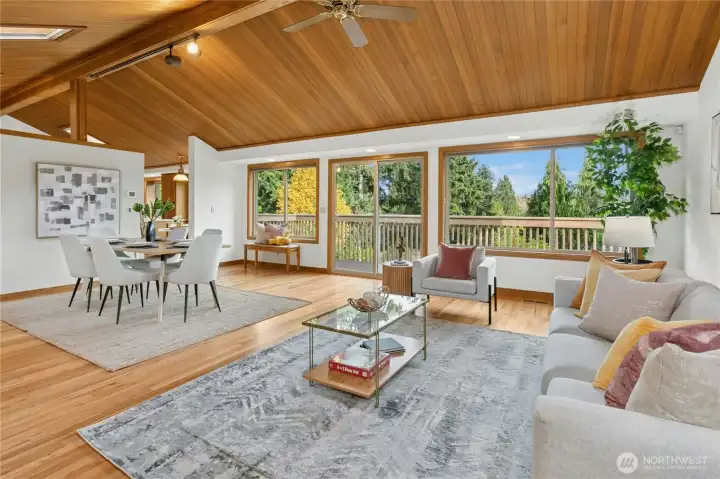 Mid-century character shines in this well-maintained 4BD/2.75BA, 2,170 sq ft home. Updated in 1987 with vaulted ceilings, an expanded kitchen layout, and natural light through skylights. Move-in ready with excellent potential for buyers planning to personalize the kitchen or reimagine the lower level. Enjoy a large entertainment deck overlooking native landscaping, a terraced backyard, and glimpses of mountain views from the yard. The quiet, wooded setting offers privacy and space for gardening and gatherings. Lower level features a separate entry for guests or flexible use. Additional highlights include extensive built-ins, a 10x16 shed, and a sprinkler system, and a security system. 5 min from Town Center, Grace Cole Park. No HOA.