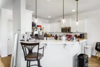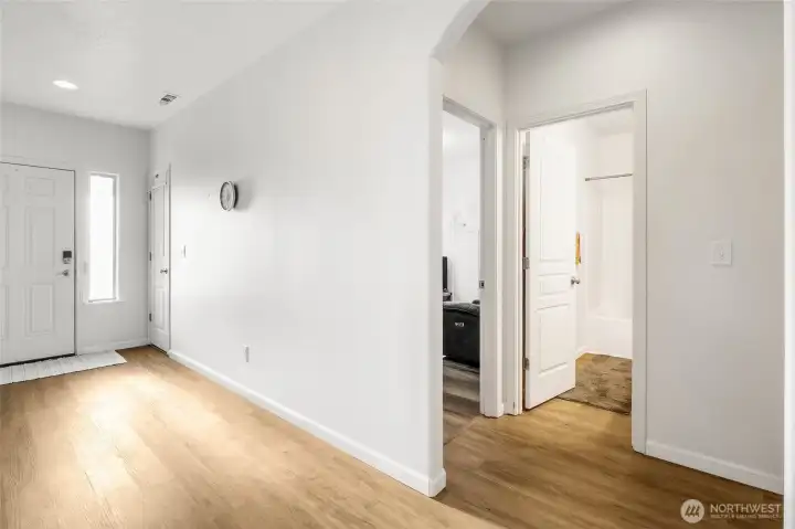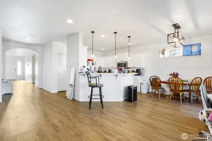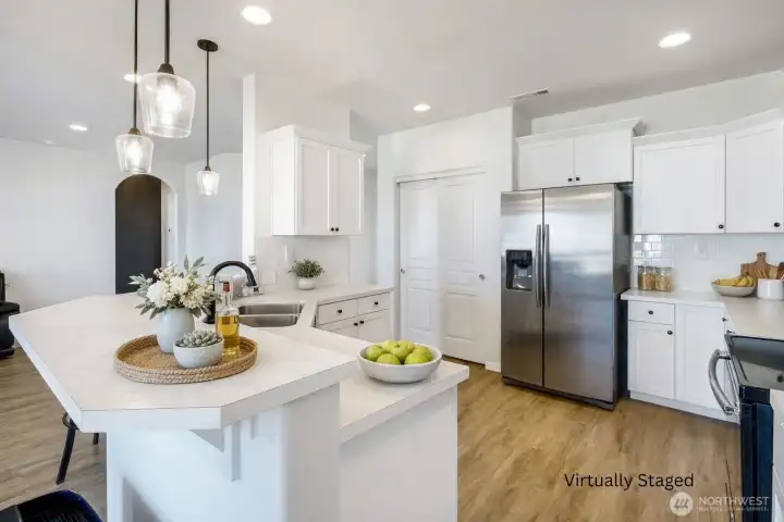 Nicely upgraded home in convenient Crossroads neighborhood! Popular Hudson model is a single level 3 bedroom, 2 bathroom plan with 1580 square feet. The large kitchen features beautiful white soft close cabinets, stainless steel appliances, bar counter seating and a large pantry. Vinyl plank flooring through out the home, designer light fixtures and custom accent walls give this home great function and style. The large primary suite includes a walk-in closet, dual sinks, private water closet and stand up shower. The roomy backyard has been fully fenced and includes a covered patio for enjoyment of the outdoor space. Even the insulated garage is upgraded with an extra 4 foot extension. All kitchen appliances, washer and dryer are included.