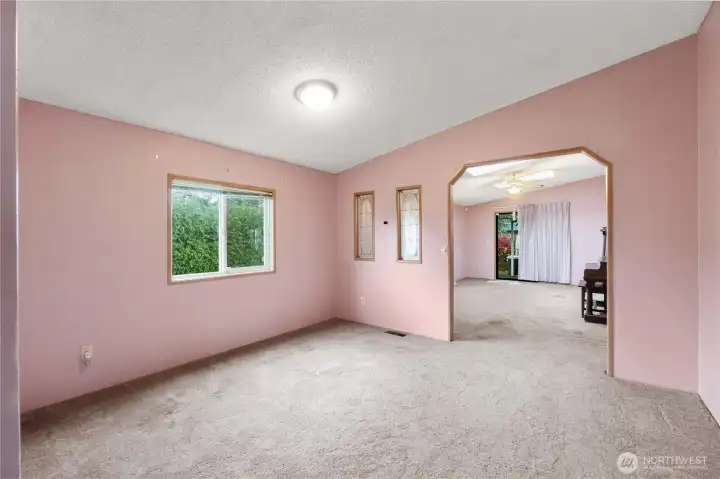 Large corner lot and fantastic layout in a 55+ park. This home lives large with its 1724 sq ft layout there's tons of space. The primary bedroom is on one end of the home and it includes a large closet and private bathroom with a newer walk in shower. On the other end you'll find 2 additional bedrooms with a bathroom and the large family room with a slider to the outside. In the middle is a living room, kitchen, dining room and utility room. Tall ceilings make the home feel even larger. The carport parking fits 2 cars and more can park uncovered. There is AC for the warmer months and a newer furnace for the chilly times. Lot rent is low at $713.00 a month.