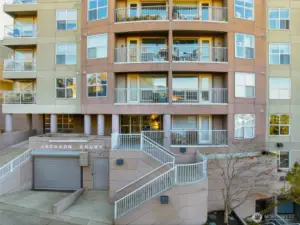 Ideally located between Capitol Hill and South Lake Union, this move-in ready, south-facing condo at Jackson Court offers exceptional privacy and a quiet urban retreat. Freshly painted throughout, it features an open living area with a cozy gas fireplace and dining space flowing to a private patio with storage. The functional kitchen, updated bath, and spacious walk-in closet provide comfort and convenience. In-unit laundry, dedicated parking, gym, and rooftop deck included. Pet-friendly with no rental cap — come see for yourself how peaceful this unit is!
