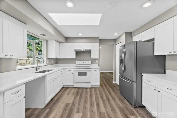 Beautifully remodeled rambler! Step into this stylishly updated 3-bedroom, single-story home showcasing a renovation that brings fresh, contemporary living to a classic layout. Enjoy a brand-new kitchen featuring sleek quartz countertops. Fresh interior paint and trim, new LVP flooring throughout, and new carpet in the bedrooms. The renovated bathrooms add a touch of luxury with new vanities, sinks, inserts, and more. The spacious, level lot, freshly landscaped, offers room to relax and entertain. An attached two-car garage provides convenience and extra storage. Dedicated 1/2 bath with laundry room equipped w/ washer & dryer. Located in a desirable neighborhood close to parks, schools, and amenities—this move-in-ready gem is a must-see!