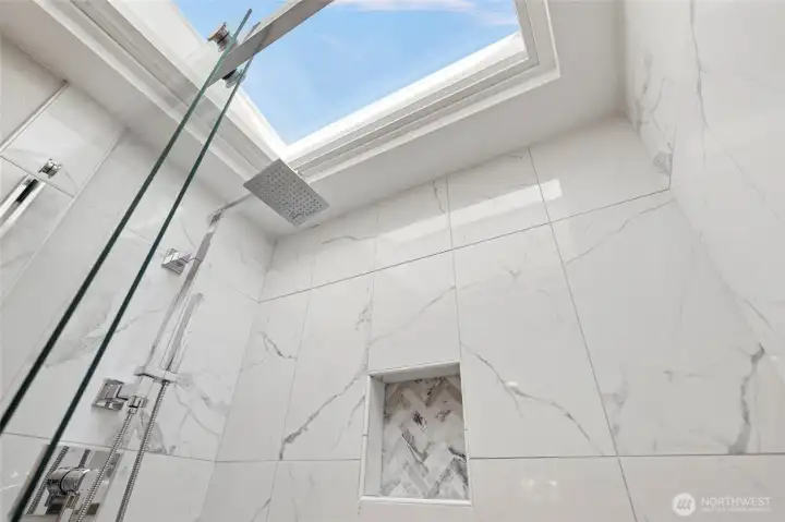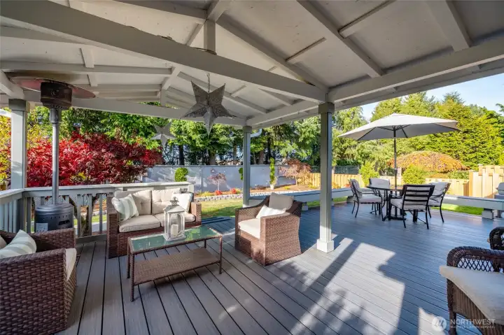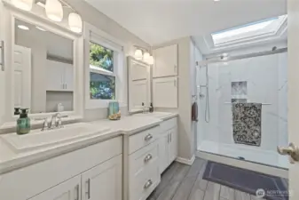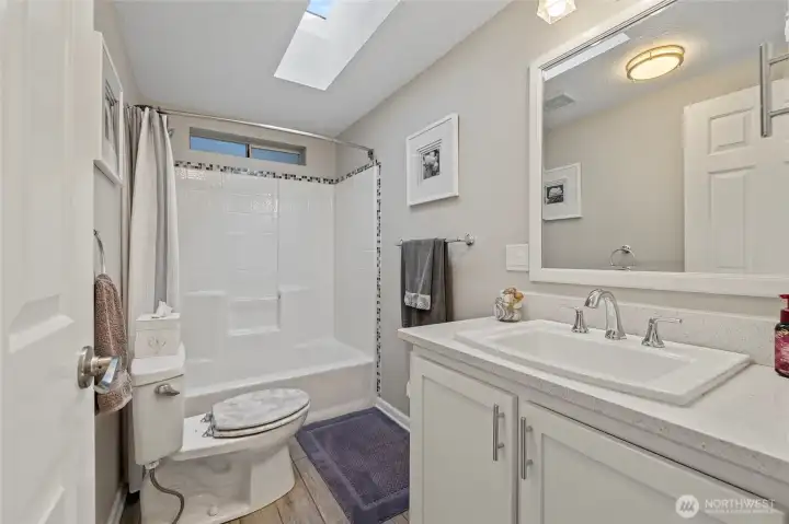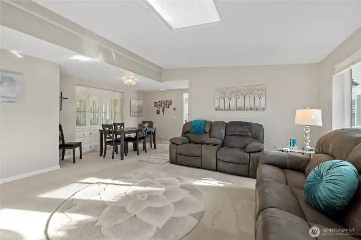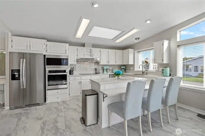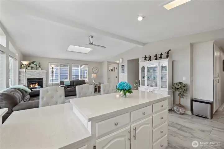Stunning 3 bed 2 bath home in top Mount Vernon 55+ community. 1774 Square feet tastefully renovated to perfection. Bright, open airy floor plan with large windows and skylights. Gorgeous kitchen with quartz, newer SS appliances, island, built in oven/micro., open to family room w/gas fireplace. Formal living room/dining area w/built in cabinetry. Spacious primary bedroom with walk in closet, remodeled bath w/heated floors, 2 additional bedrooms with renovated shared bath. Sunny large covered composite deck are for relaxation and entertaining. Laundry room with SS sink and abundant storage. New roof in 2022,furnace w/AC 2023 Water heater 2021.9 x 22 shop area with storage. Located near all services, clubhouse with pool/activities.