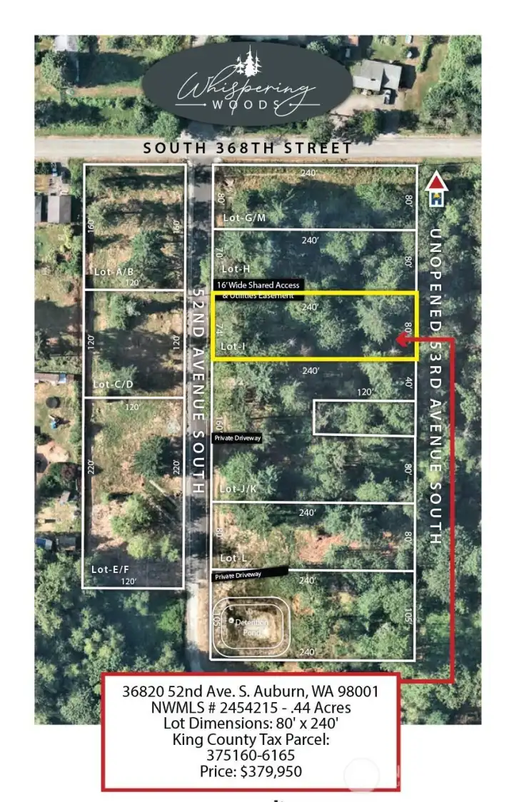 Whispering Woods Estates (“WWE”) is an entitlement-approved large-lot community on Auburn’s desirable West Hill in South King County, situated just north of the City of Edgewood. This thoughtfully planned eight (8) lot neighborhood spans 4.49 acres and delivers privacy, certainty, and long-term value. WWE offers convenient commuter access to I-5, Hwy 167, Hwy 18, and a 10-minute drive to Milton Safeway, Starbucks, Federal Way Costco, medical services, dining, and parks. Lot I is .44 acres and measures 80' wide by 240' deep. The Easterly boundary of Lot I is 80' wide and is adjacent to undeveloped 53rd Ave S, a 60' county right-of-way that is in the process of being vacated. Unlike most raw land offerings, Lot I benefits from extensive developer-completed entitlement work, including drainfield/storm engineering, surveys, and county approvals. This work eliminates buyer risk while accelerating financing, design, permitting, and construction timelines. Buyers may design/build independently as an owner-contractor or work with a designer and/or builder referral from the developer. King County Council vote set for 5/17/26 (V-2735): Whether to vacate 52nd Ave S (S 368th–S 370th) and enable HOA to pursue gated access to WWE. Drainfield design for Lot I approved 1/29/25. Lakehaven Water and PSE power are both available along 52nd Ave S. HOA documents, Bylaws, and CCRs have been drafted to maintain consistent architecture, building standards, and long-term property values.
