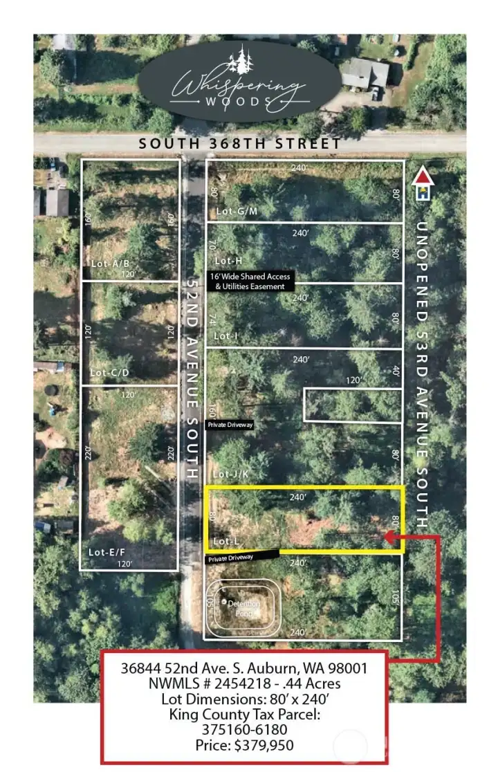 Whispering Woods Estates (“WWE”) is an entitlement-approved large-lot community on Auburn’s desirable West Hill in South King County, situated just north of the City of Edgewood. This thoughtfully planned eight (8) lot neighborhood spans 4.49 acres and delivers privacy, certainty, and long-term value. WWE offers convenient commuter access to I-5, Hwy 167, Hwy 18, and a 10-minute drive from Milton Safeway, Starbucks, Federal Way Costco, medical services, dining, and parks. Lot L is .44 acres, and 80' wide by 240' deep. Lot L is partially bordered by two (2) greenbelt buffers, and a unbuildable 105' x 240' Lot N (.58 acres) borders its immediate south boundary. Unlike most raw land offerings, Lot L benefits from extensive developer-completed entitlement work, including drainfield/storm engineering, surveys, and county approvals. This entitlement work eliminates buyer capital risk while accelerating financing, design, permitting, and construction timelines. Buyers may design/build independently as an owner-contractor or work with a designer and/or builder referral from the developer. King County Council vote set for 5/17/26 (V-2735): Whether to vacate 52nd Ave S (S 368th–S 370th) and enable HOA to pursue gated access to WWE. Drainfield design for Lot L approved 1/30/25. Lakehaven Water and PSE power are available along 52nd Ave S. HOA documents, Bylaws, and CCRs are being drafted to maintain consistent architecture, building standards, and long-term property values.