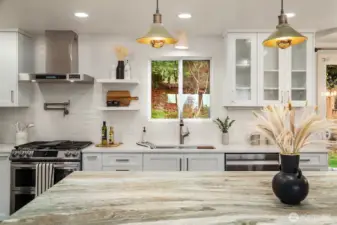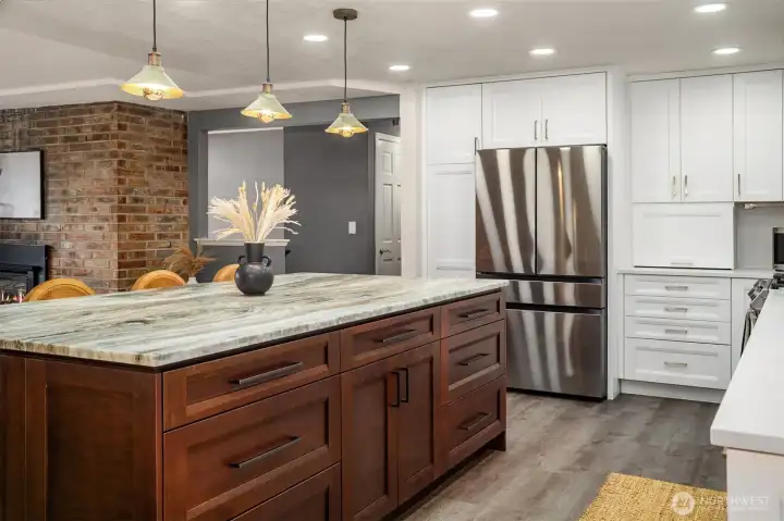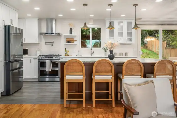 Turnkey Edmonds Bowl mid-century split-level w/ open-concept living. Light-filled main features spacious living w/ brick fireplace & large picture windows w/ Sound & Olympic views. Remodeled chef’s kitchen offers huge slab island, quartz counters, shaker cabinets, pot filler, SS appliances w/ dual ovens & open shelving. Dining area opens to fully-fenced backyard. 3-beds on main, including the Primary Suite. All baths updated. Lower-level rec room provides great flex space. Hardwoods throughout. Updated lighting, 2-car garage. New furnace & heat pump (2024) & attic insulation (2025). Sited on a large 1/4 acre lot on a residential street. 2-car garage & ample street parking. Moments to DT Edmonds shops, restaurants, farmer's market & beach.