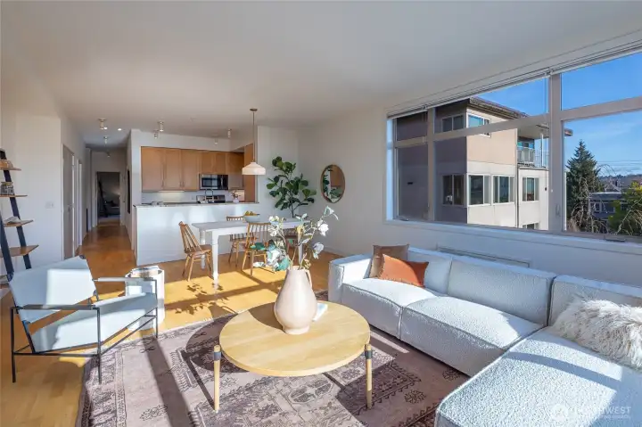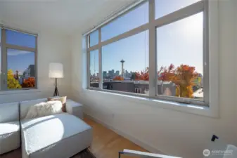 Location, views and lifestyle at the desirable Willis Condos. This sun-drenched south-facing corner unit offers super convenient access to Queen Anne, Uptown, South Lake Union, and Downtown. Tons of light from expansive south facing windows, enjoy breathtaking views of the Space Needle, glittering city skyline, and Puget Sound. Pristine 2BR open floor plan boasts a chef's kitchen with gas cooking, stainless steel appliances and granite counters. Generous primary suite overlooking a serene courtyard, large walk-in closet with new organizers, plus a flexible second bedroom that doubles as office or guest space via Murphy bed. Savor rooftop deck evenings with BBQs and sweeping panoramas. Includes two-car parking and storage.