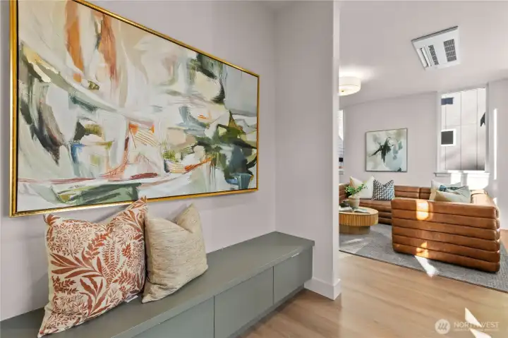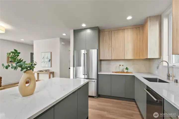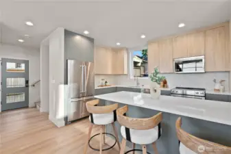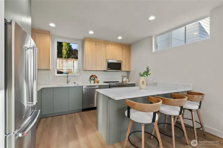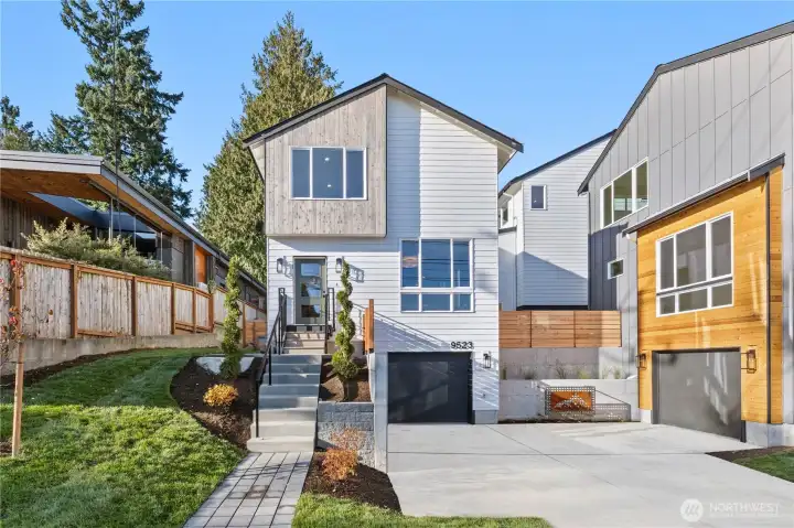 Thoughtfully designed new construction in Seattle’s desirable Maple Leaf neighborhood. The entry welcomes you with custom built-ins and flows into a spacious living room showcasing mountain views and abundant natural light. The functional kitchen features a large quartz island with seating, stainless steel appliances, and plenty of workspace for meal prep and entertaining. A convenient half bath completes the main floor. Upstairs offers two generous bedrooms, each with its own ensuite bath. Attached garage with EV charging and private yard space provide added comfort and convenience.