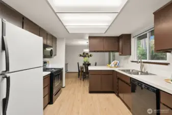 Tucked into a quiet Silverdale neighborhood lined with lush evergreens, this tri-level offers comfort, privacy and room to unwind. New easy-care flooring throughout lower levels and stylish lighting add a fresh feel to the spacious layout. The backyard is a true highlight -- fully fenced, expansive, and backed by a greenbelt. Primary suite opens to your upper deck -- perfect for AM coffee and PM unwinding. Stay cool with central A/C, and cozy in winter with 2 fireplaces. With quick access to highway, shopping, dining, and top-rated Central Kitsap schools, this peaceful retreat is close to everything, but feels a world away.