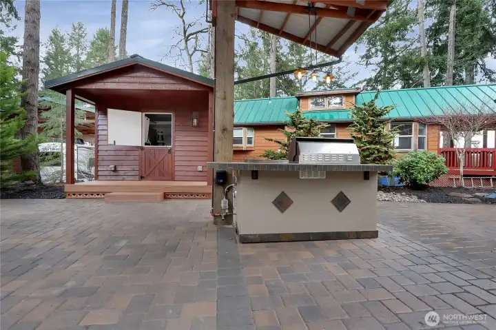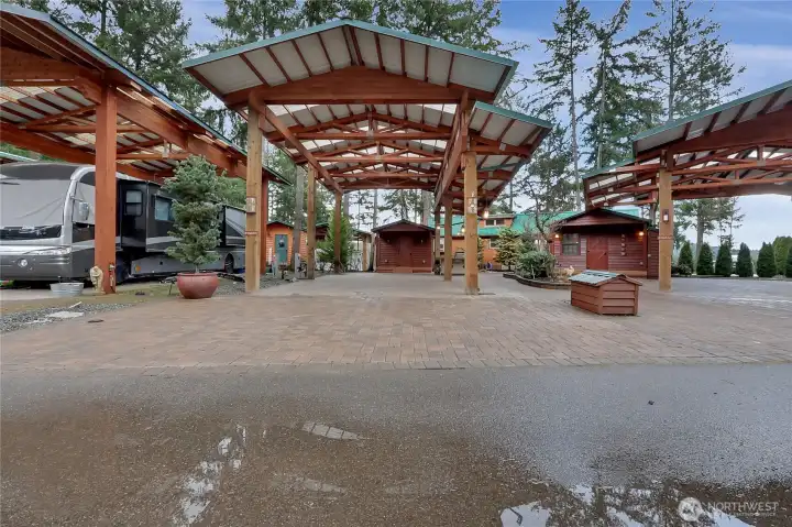 Charming Maple 25 RV site on a desirable 3,187 sq ft lot! Features an oversized pole barn cover extending over the fully paved site with lighting and a peaceful water feature. Enjoy outdoor entertaining with a large BBQ island hard-wired to an in-ground propane tank and equipped with a refrigerator. The 10x12 shed includes a NEW washer and propane dryer, hot water tank, mini kitchen with sink and refrigerator and toilet with vinyl flooring, and ample storage. Community amenities include indoor/outdoor pools, sauna, fitness center, pickleball, mini golf, playgrounds, and hiking trails. The clubhouse hosts activities throughout the week and is available to rent for your private parties.
