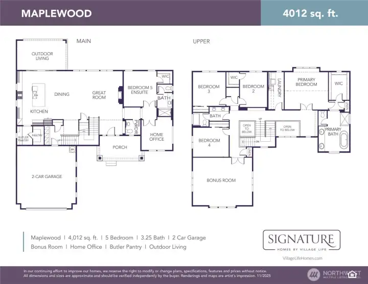 [The Maplewood] Presented by Signature Homes- Village Life. Luxury 2025- 4012 SQ FT 5-bedroom 3.25 Bath + Office+ Bonus Room. No Detail Spared w/this Gorgeous Open Concept Layout. Huge Entertainers Kitchen w/Oversized Island, Butler's Pantry, Beverage Center & Duel Ovens. French Doors Open to Covered & Heated Patio. Mainfloor Features Junior Suite with 3/4 Bath + Office/Den. The Upper Level Features Primary Suite w/Vaulted Ceilings, 5 Piece Lux Bathroom w/Soaking Tub & Huge Closet Space. 3 Additional Generously Sized Bedrooms. Bonus Room Perfect for Game & Movie Nights. Large, Flat & Fenced Backyard. Front Yard is Expertly Landscaped w/Irrigation. Gas Furnace + Heat Pump for AC. Minutes to Downtown Edmonds, Beach, Dining, & Shopping