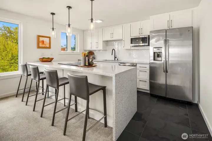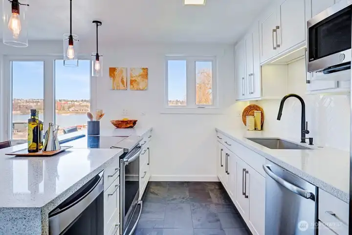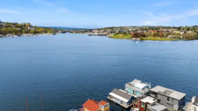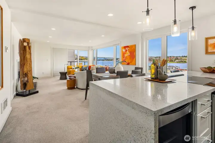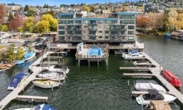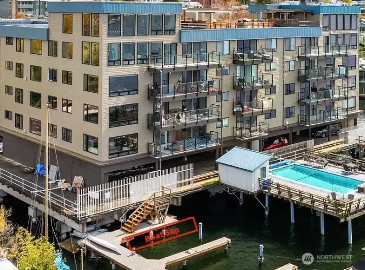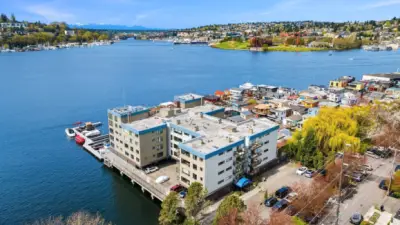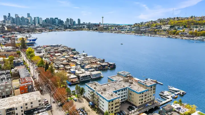 Experience the quintessential Lake Union lifestyle every day in this fully-updated corner unit bathed in natural light, with views that will leave you speechless. Spend your days boating or watching seaplanes, and your evenings soaking in the beauty of sunsets over the Aurora Bridge and Gasworks Park. The kitchen boasts a waterfall quartz countertop with seating, an induction stove, and built-in beverage fridge. The expansive primary suite offers a private balcony, walk-in closet, en-suite bath, and laundry. Swim and sunbathe at the one-of-a-kind pool over the Lake. Launch your paddleboard or kayak from the marina. Property includes two parking spaces, EV charger, storage, and a boat slip. Your lakeside home awaits!