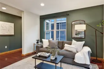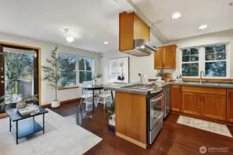 Tucked away in the Greenwood/Green Lake neighborhoods, this private townhome overlooks the Interurban trail leading South to Lake Union & up to Interurban North Trail. Fully-fenced lower patio, perfect for gardening, relaxing or storage, as well as a spacious deck extending entertaining space just off the kitchen & living area. One bedroom on lower level that has a Murphy bed allowing for /guest/office/flex space w/ bathroom & laundry. Vaulted ceilings in primary bedroom w/ 3/4 bathroom & large closet on the upper floor. Efficient radiant heat, on-demand water heater, no HOA dues, covered carport and driveway parking. Easily accessible to Aurora, I-5, grocery stores, restaurants & coffee shops. Bike Score- 89%!!! Convenient location!