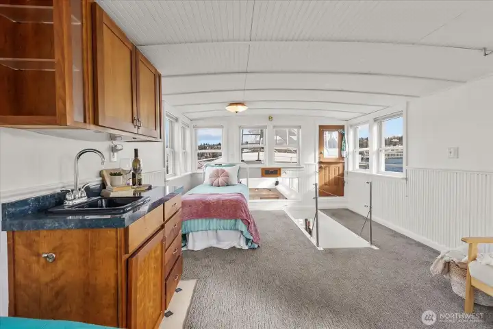 Welcome aboard to this end-of-dock Seattle Houseboat with breathtaking water views. Relax on the spacious rooftop deck or two covered main-level decks. Enjoy vaulted ceilings, walls of windows, full kitchen with breakfast bar, built-in queen bed, full bath, and washer/dryer combo. The upper bonus room with built-in bar is perfect for guests, entertaining, or home office. You will love watching the fireworks, Duck Dodge, water planes, & incredible sunrises over Lake Union. Slip lease is $1,598/mo & includes moorage, insurance, DNR, facility fees, liveaboard status, & Property Data Protection. Paddleboard, kayak, or relax while living the lake lifestyle. Financing available. Minutes to Amazon, Google, & Adobe. Pets & rentals OK.