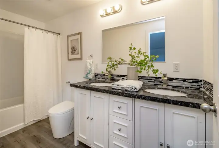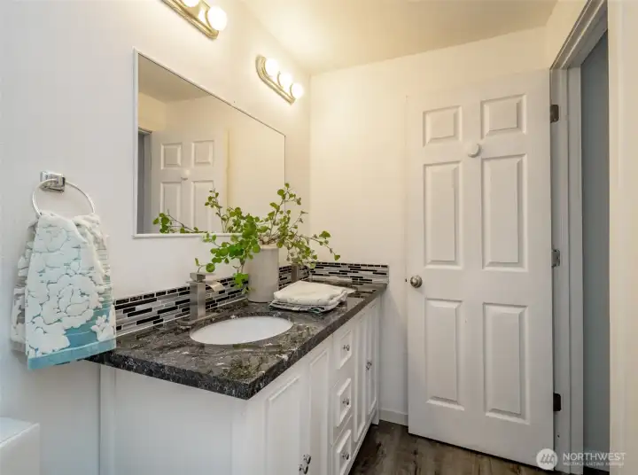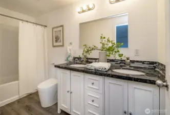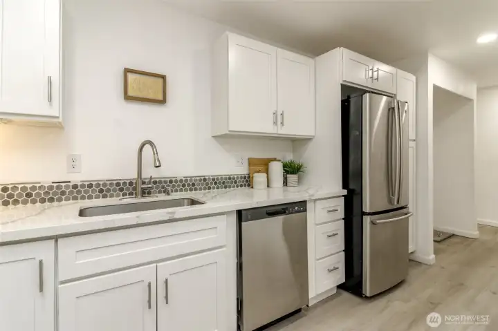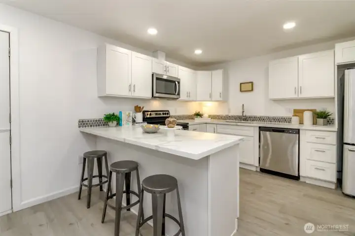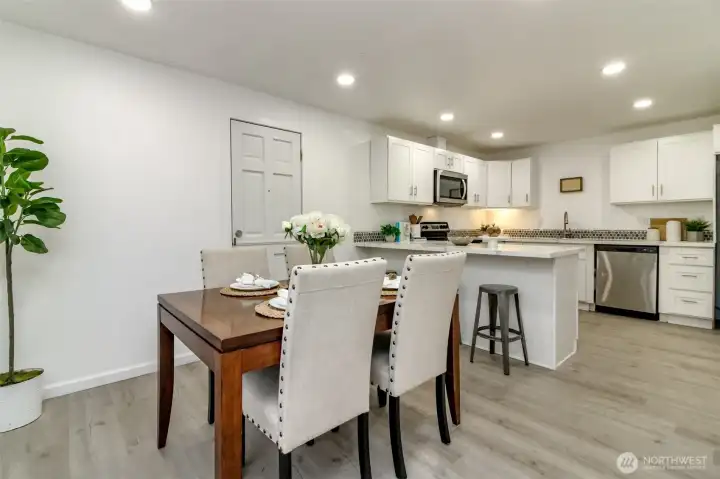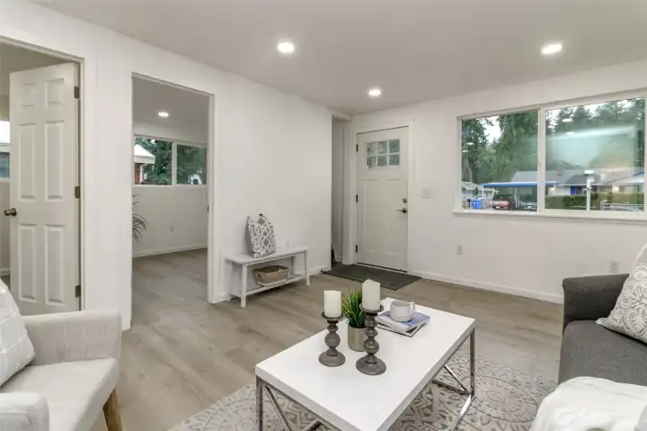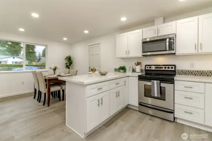 Welcome Home to Renovated 4 beds 2 baths rambler in a nice quiet neighborhood w/ NO HOA. New roof & new electrical within the last two years. Step inside to enjoy new flooring, fresh paint, and an updated kitchen featuring white shaker cabinets, quartz countertop, and ample counter space. The dining area w/ Dutch door opens to a large, covered patio, perfect for year-round entertaining. All bedrooms are comfortably sized, and the main bath offers a double-sink vanity. The spacious primary suite includes a walk-in closet and an updated 4-piece bathroom with contemporary finishes. The property is fully fenced with generous front and back yards—ideal for pets, play, or gardening. 5 - 10 mins to I-5, Hwy512, JBLM, Spanaway Lake & all amenities.