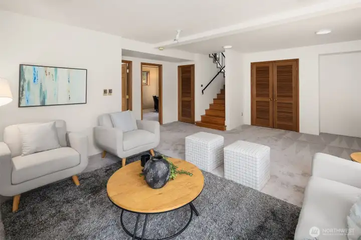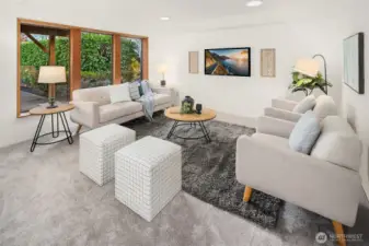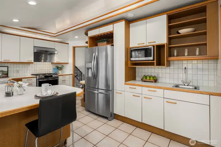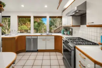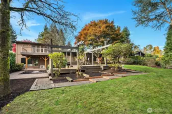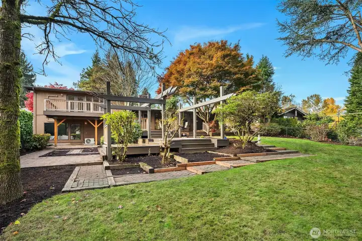 This classic Pacific Northwest home, set on a quiet street in Bellevue’s cherished Woodridge neighborhood, welcomes you with slate tile and vaulted ceilings. An exposed beam, wood accents, and a floor-to-ceiling stone gas fireplace warm the living room. Enjoy views of the incredible backyard with established shrubs, paver patios, all-weather decks, garden beds, and a trellis from the kitchen and dining room. The primary suite is clad in hardwoods with French doors to the upper deck. The lower level has a spacious family room. Recent updates include fresh paint inside and out, new LVP flooring, and carpet. The home backs to Woodridge Open Space. Woodridge Elementary is nearby. Located just moments to downtown Bellevue or Factoria.