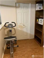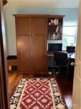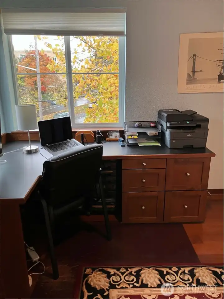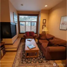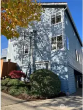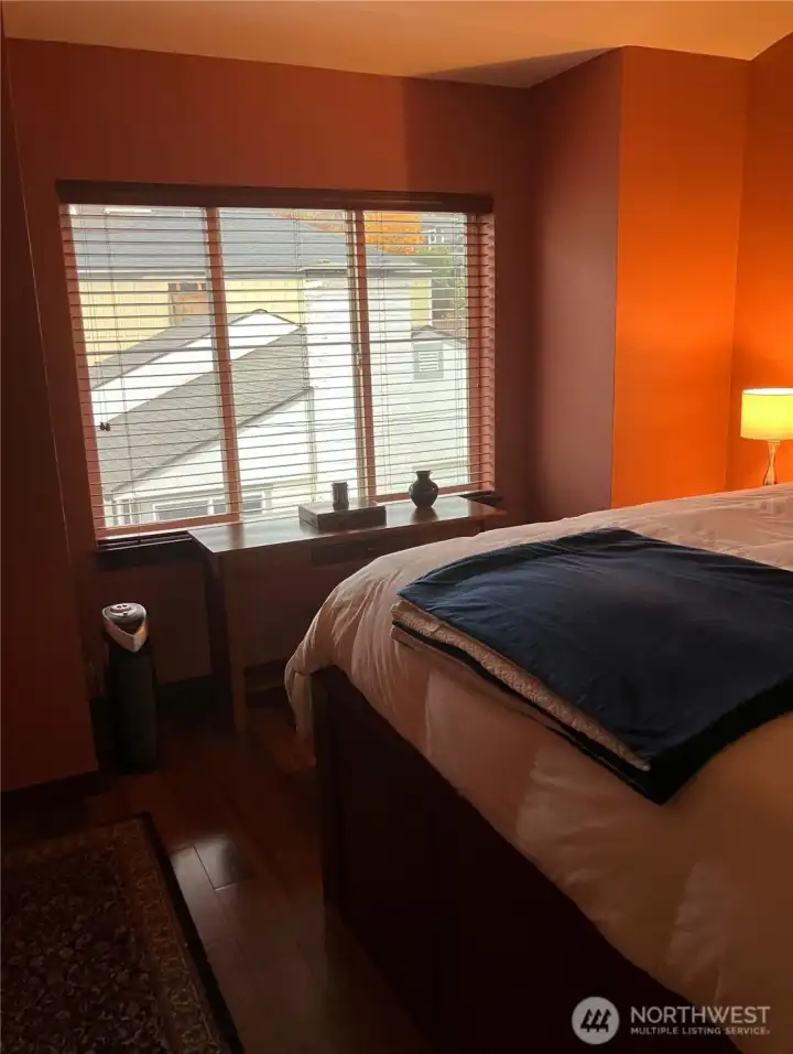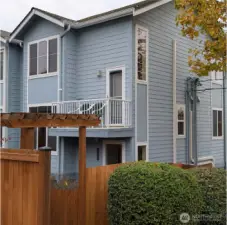 Carefully maintained light-filled townhome with southern exposure and numerous updates: granite kitchen counters and breakfast bar + new appliances; hardwood on the stairs to the second floor; both bedrooms have Brazilian walnut hardwood floors. The second bedroom features a built-in wooden desk with file drawers, built-in storage shelves and a twin-sized wall bed; matching overhead wood shelving on three walls completes the room. The partially finished garage contains considerable built-in storage space/shelving along with an exercise area with cork flooring. Living room has a gas inset fireplace, and a heat pump provides heat and AC upstairs and down. Charming deck overlooks fenced corner lot front yard.