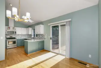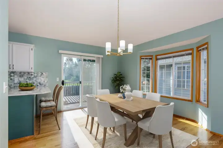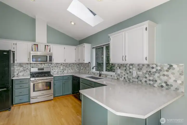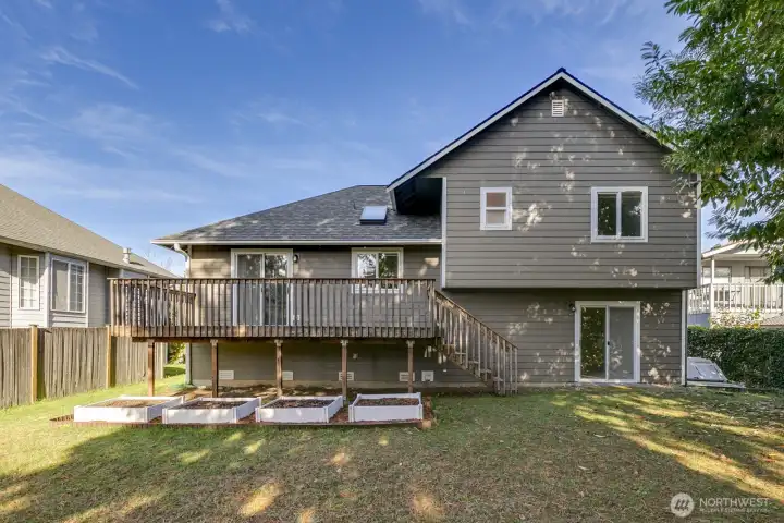 Step inside and be greeted by hardwood floors, vaulted ceilings and living room equipped with a gas fireplace and bay window. Dining room is open to kitchen with eating bar. The heart of the home is the updated kitchen, featuring luxurious quartz countertops including a premium gas range. Whether you're a culinary enthusiast or simply love gathering with friends and family, the open kitchen, dining and living room promises to be a hub for gatherings. Primary bedroom is complete with full bath and walk in closet. Updates include new carpet, lighting, fresh interior and exterior paint. Enjoy your morning coffee or have a BBQ on the Trex deck overlooking the level backyard perfect for play or gardening and backs up to a picturesque park.